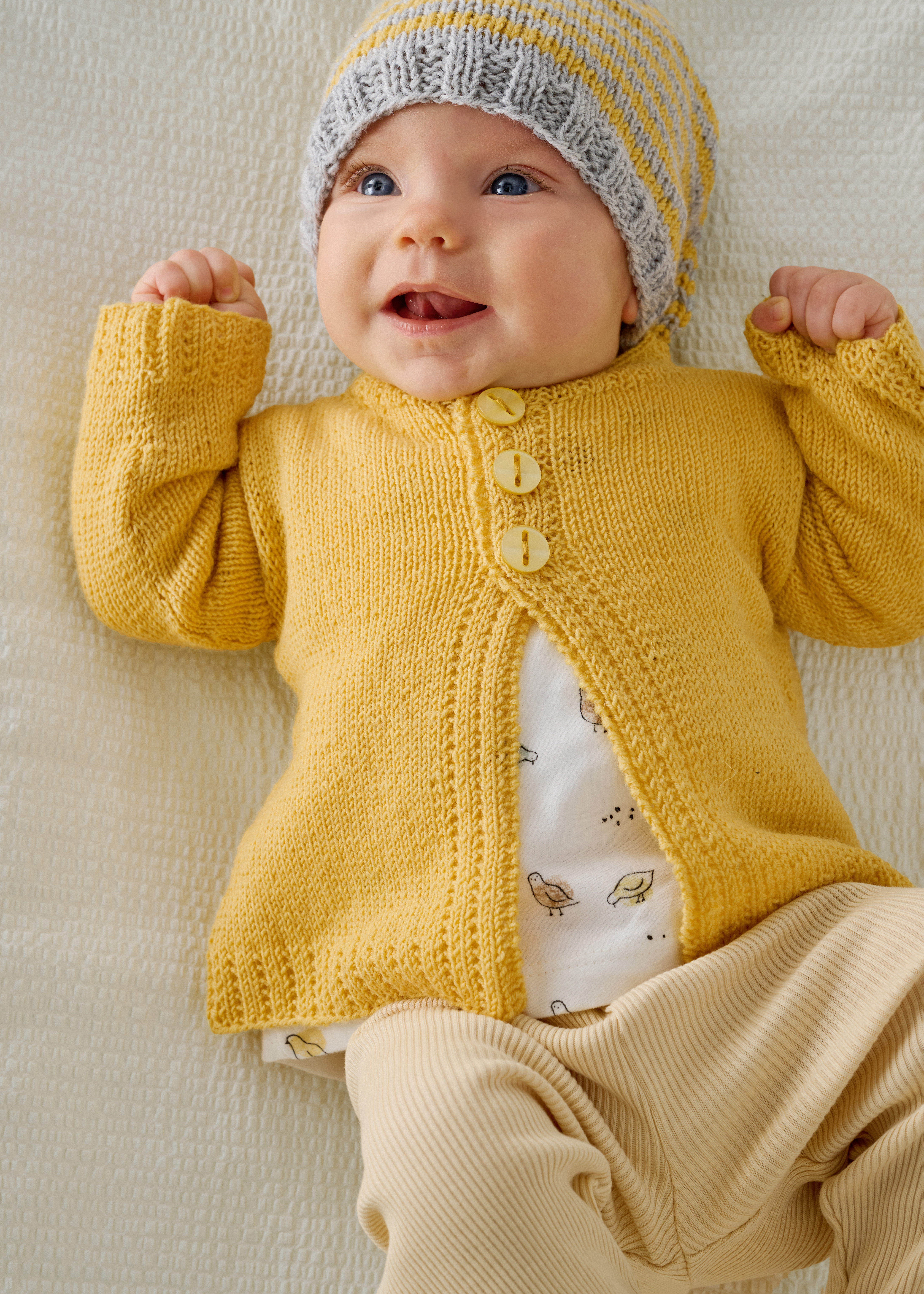 Lana Grossa Cool Wool Baby (100% scheerwol (merino extrafijn); ca. 220 m/50 g): 100 (150/150/200/ 250) g geel (kl. 273); rondbreinld 2,5-3 mm; markeerringen; 3 knopen met 15 mm Ø.