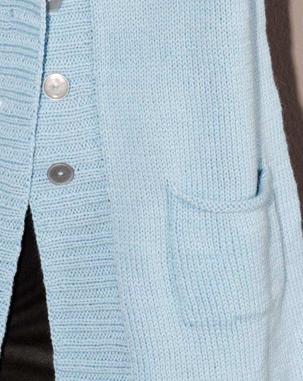 Het lange vest is een klassiek model dat in elk jaargetijde weer uit de kast gehaald wordt. De lichtblauwe kleur zorgt voor een frisse uitstraling.