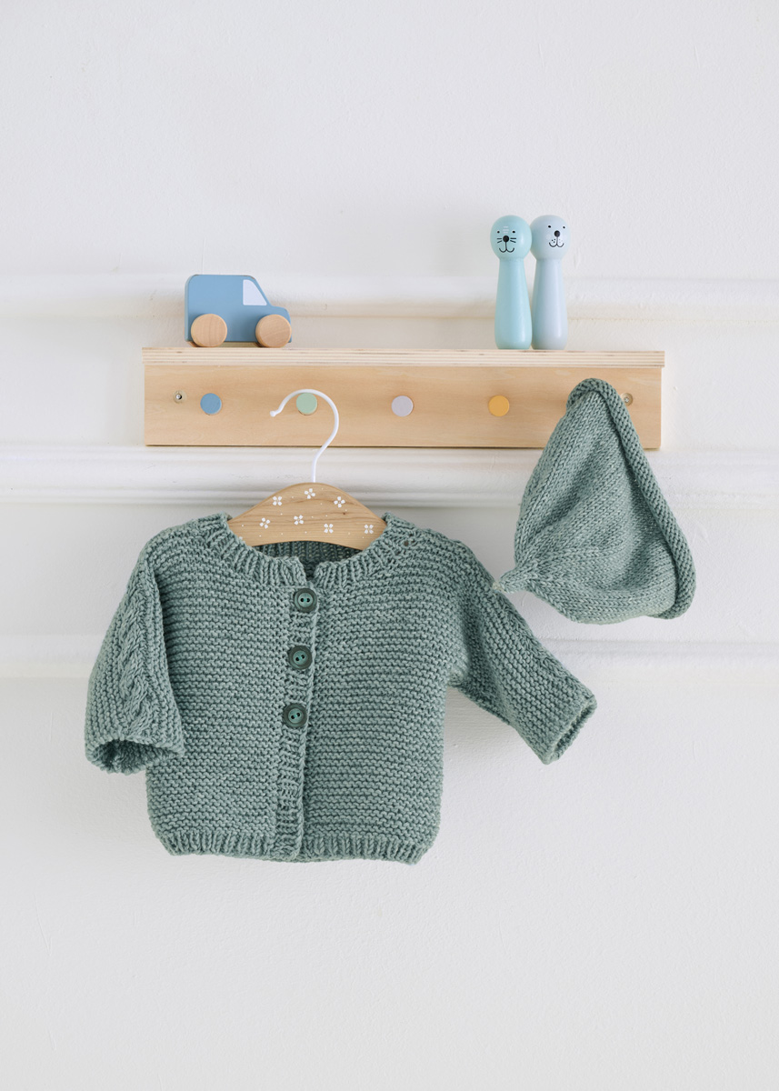 Lana Grossa Cool Wool Big (100% scheerwol (merino extrafijn); ca. 120 m/50 g): 150 (150/200/250/300) g licht watergroen (kl. 984); rondbreinld 4 mm; 1 kabelnaald; 3 knopen met 18 mm Ø.