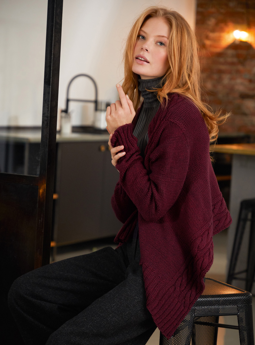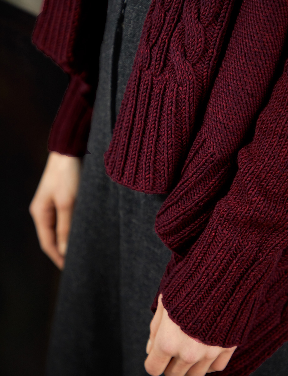 na Grossa-garen „Cool Wool Big Mélange“ (100% scheerwol, ll. = ca. 120 m/50 g); ca. 600 (650 - 750 - 800) g donker-/zwartrood gemêleerd (kl. 352); breinaalden nr. 4, een ca. 80 cm lange rondbreinaald nr. 4,5, een hulpnaald.