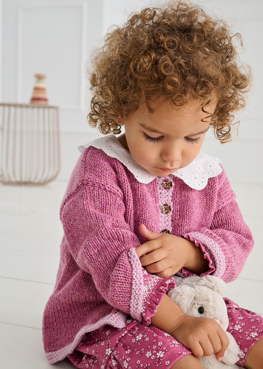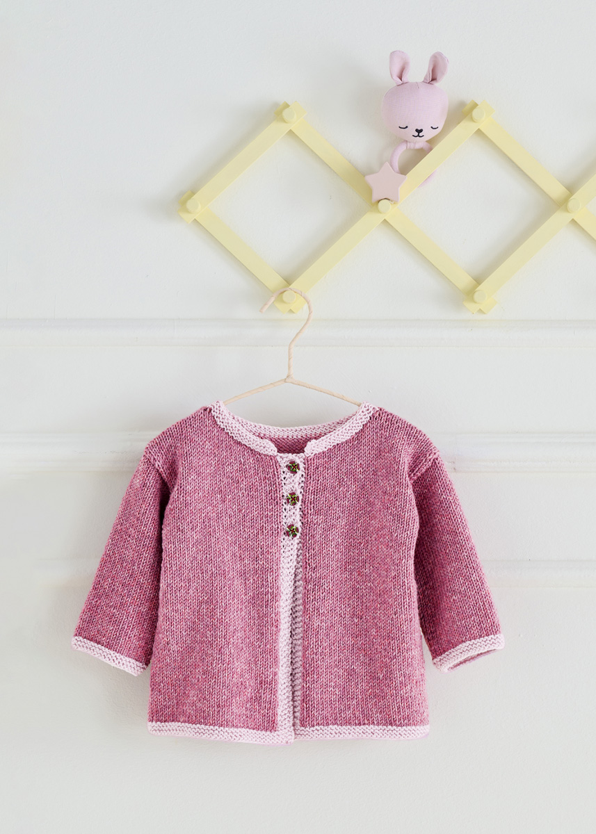 Lana Grossa Cool Wool Big Vintage (100% scheerwol (merino extrafijn); ca. 120 m/50 g): 200 g felroze (kl. 7189) en Lana Grossa Cool Wool Big (100% scheerwol (merino extrafijn); ca. 120 m/50 g): 50 g roze (kl. 963); rondbreinld 4 mm; 2 breinld zonder knop 4 mm; 3 knopen met 15 mm Ø.
