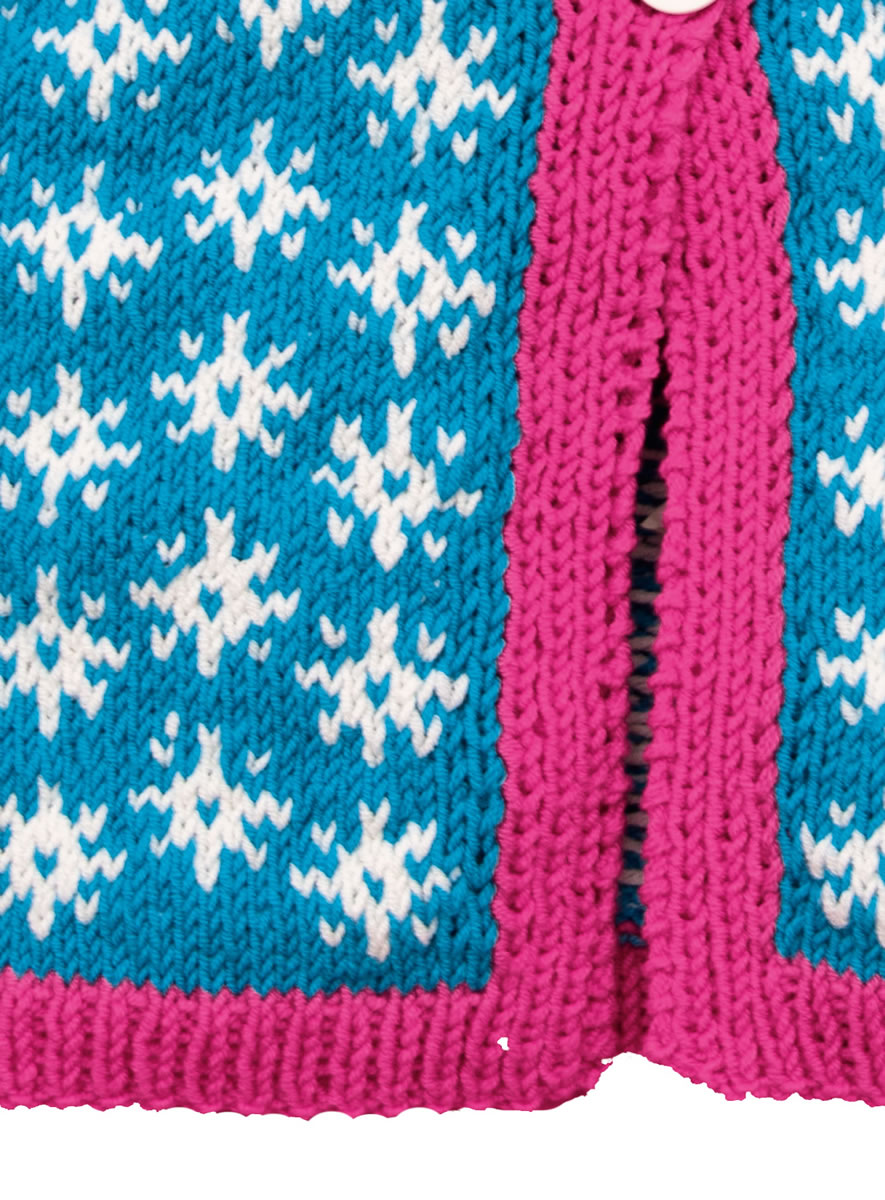 “Elastico” (96% katoen, 4% polyester, ll. = 160 m/50 g) van Lana Grossa: ca. 100 (100/150) g azuurblauw (kl. 115) en telk. 50 g wit (kl. 1) en fuchsia (kl. 100); breinld. nr. 4; een 40 cm lange rondbreinld. nr. 4; 3 knopen.