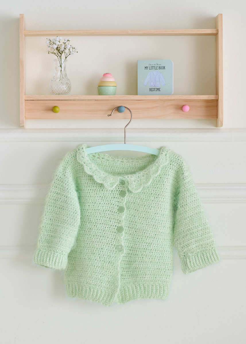 Lana Grossa Finito (73% katoen, 27% polyamide, ca. 150 m/50 g): 200 g zachtgroen/crème (kl. 4); haaknld 3,5 mm; 5 knopen met 12 mm Ø.
