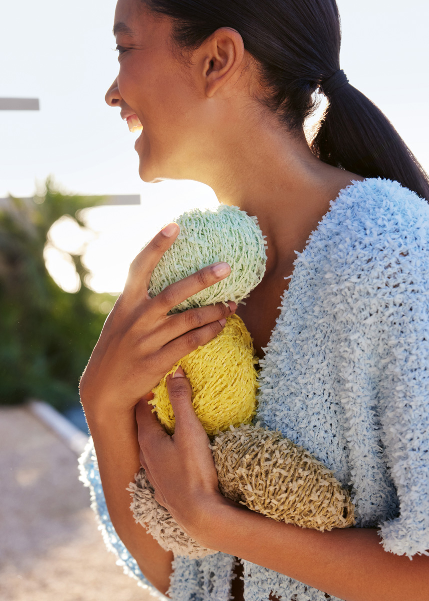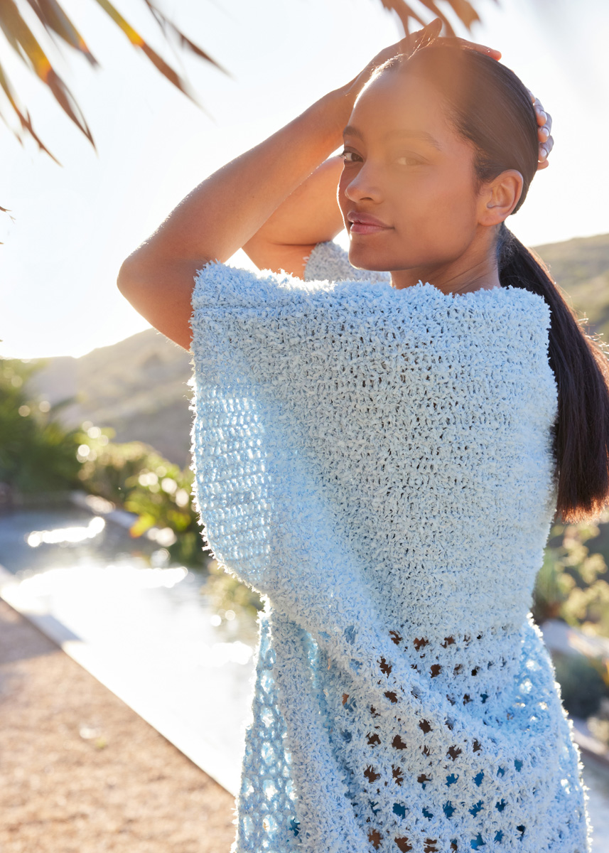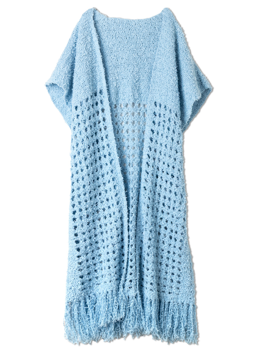 Lana Grossa Frizzante (54% katoen, 46 polyamide, ca 105 m/50 g), 700 g in lichtblauw (Fb 8); haaknld 4,5 mm en 5 mm.