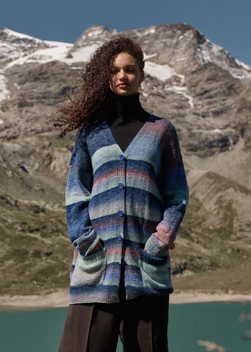 Gomitolo Fumo van Lana Grossa (50% scheerwol, 50% polyacryl, LL=ca 700 m/200 g): 2 (2 - 3 - 3) klw. = ca 400 (400 - 600 - 600) g zachtgeel/-groen/lichtgroen/ lichtgrijs/grijslila/mint/petrol/antraciet (kl. 517). Lange rondbreinld. nr. 4 en 4,5. Korte rondbreinld.nr. 4,5. Nld. zonder knop nr. 4. Vijf parelmoerknopen, doorsnee ca 22 cm.