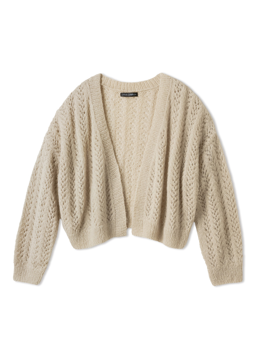 Lana Grossa-garen ‘Setasuri’ (69% alpaca (suri), 31% zijde, ca. 212 m/25 g): ca. 250 (250 - 275) g parelbeige (kl 36); breinld 4 mm en 5 mm; 1 lange rondbreinld 4 mm.