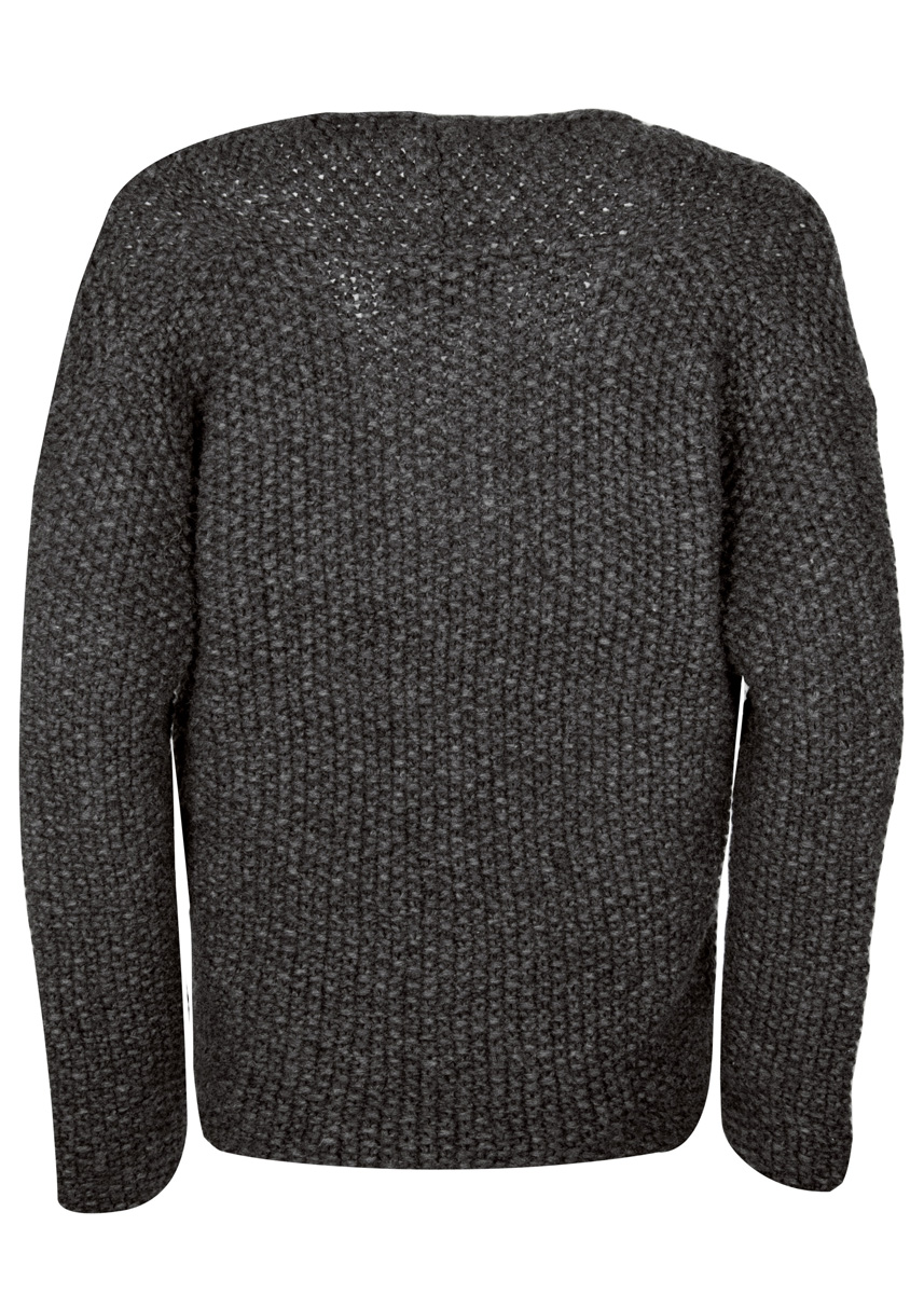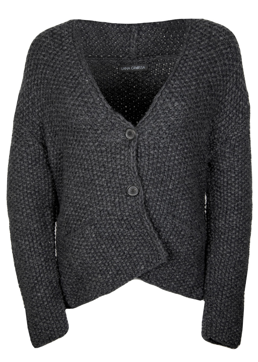 „Lala Berlin Lovely Cotton“ (75% merinosscheerwol superfij, 25% katoen, ll. = ca. 90 m/50 g) van Lana Grossa: ca. 500 (550 – 600) g antraciet (kl. 8); breinaalden nr. 7 en 8; 2 hoornen knopen met 4 gaatjes van Union Knopf, art. 36428, ø 25 mm, kl. 80 zwart