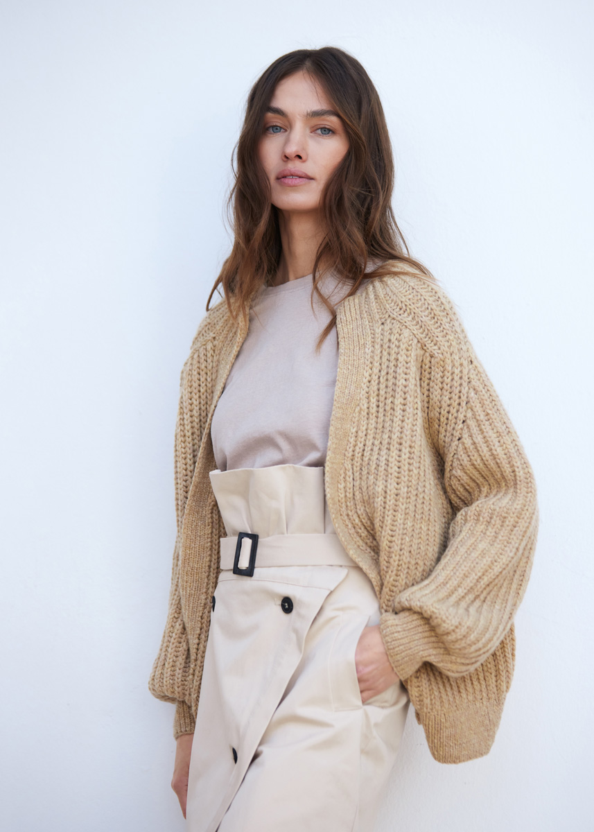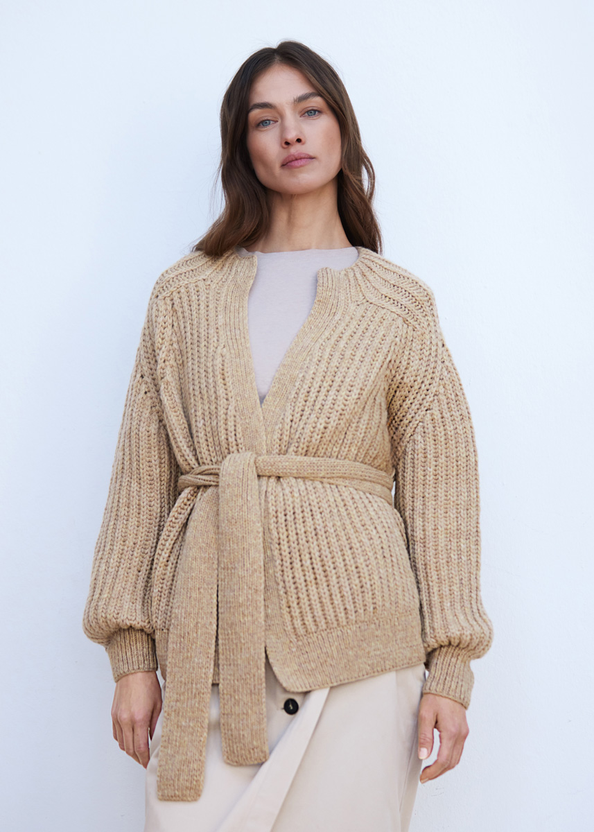 Lana Grossa ‘Cool Merino Big’ (90% scheerwol (merino), 10% polyamide, ca. 90 m/50 g): ca. 600 (650 - 650 - 700) g beige (kl 223); garen van Lana Grossa ‘Cool Merino’ (90% scheerwol (merino), 10% polyamide, ca. 150 m/50 g): ca. 200 (250 - 250 - 300) g lichtbeige (kl 23); breinld 3,5 mm + 5 mm.