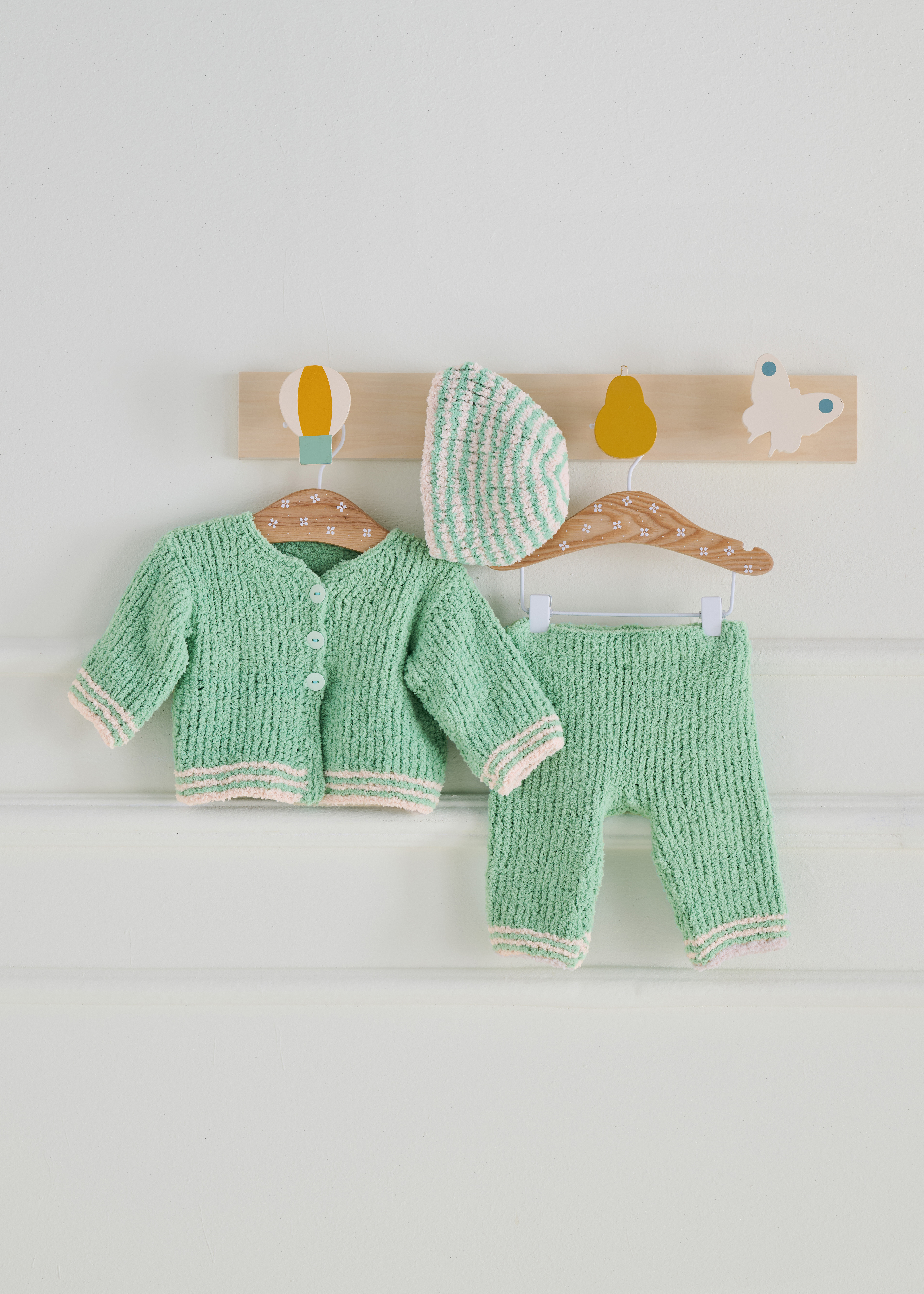 Lana Grossa Leggerissimo (100% polyamide; ca. 150 m/50 g): 50 (50/50/100) g mintgroen (kl. 11) en 50 g wit (kl. 17); rondbreinld 4 mm; 3 knopen met 13 mm Ø.