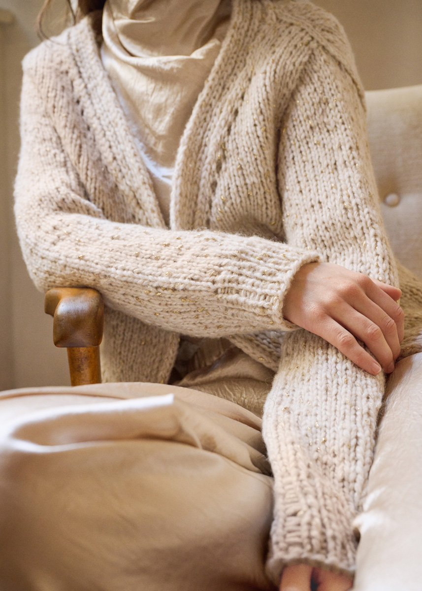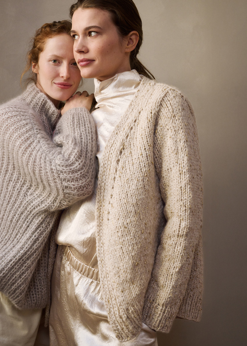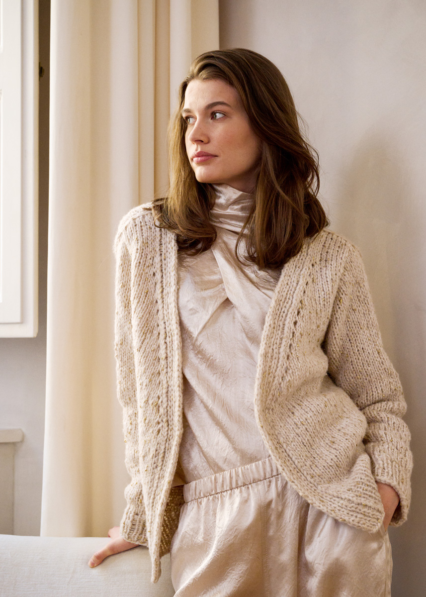 Lana Grossa-garen ‘Lucciola’ (29% polyamide, 24% scheerwol (merino fijn), 22% viscose, 20% alpaca (baby), 5% metallic vezels, ca. 130 m/50 g): ca. 550 (600 - 650 - 700) g crème (kl 7); lange rondbreinld 6 mm, 7 mm en 9 mm; korte rondbreinld 9 mm; breinld zonder knop 7 mm.