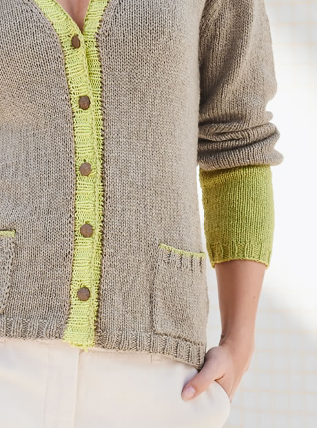 garen van Lana Grossa “Linarte” (40% viscose, 30% katoen, 20% linnen, 10% polyamide, 125 m/50 g), ca. 450 (500 – 550) g kaki (kl. 65) en ca. 50 g pistache (kl. 26) en geelgroen (kl. 43), breinld. nr. 3,5 en 4, resp. 5 knopen van UNION KNOPF, art. 451 873, kl. 34, afm. 15 mm.