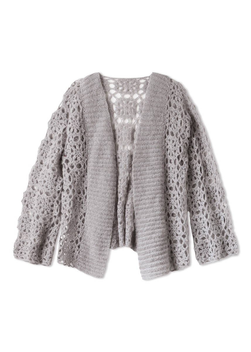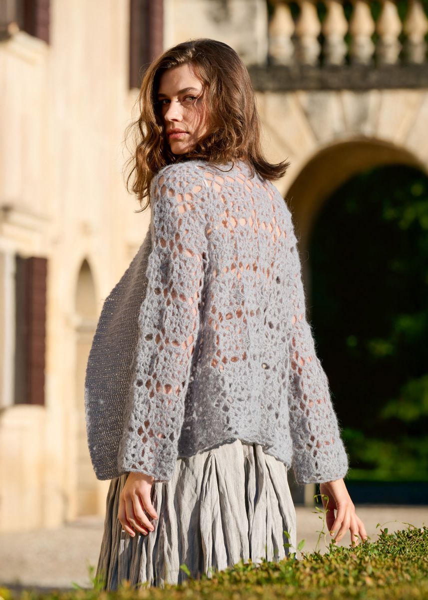 Lana Grossa-garen ‘Setasuri’ (69 % alpaca (suri), 31 % zijde, ca. 212 m/25 g): ca. 175 (275) g lichtgrijs (kl 19); haaknld 3 mm en 3,5 mm.