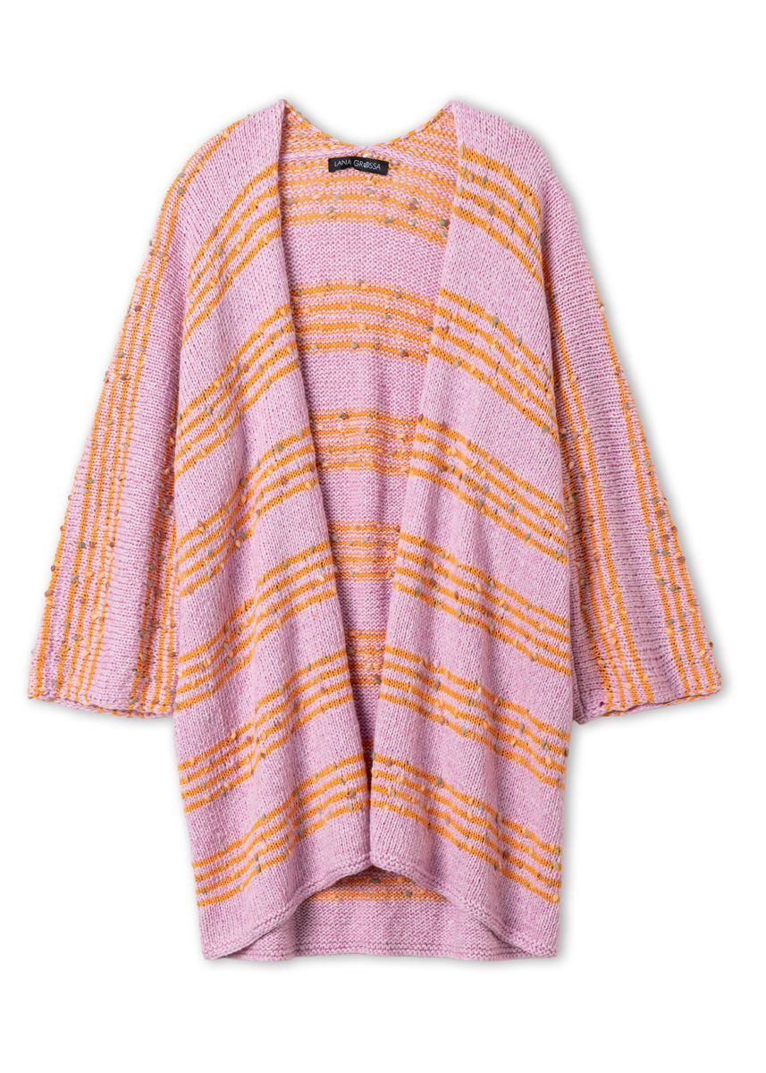 Lana Grossa-garen ‘Summer Softness’ (80% katoen (bio), 20% scheerwol (merino superfijn), ca. 130 m/50 g): ca. 400 (400 - 450 - 450) g roze (kl 28); Lana Grossa-garen ‘Popcorn’ (100% katoen, ca. 125 m/50 g): ca. 200 (200 - 250 - 250) g mandarijn/ roze/vanille/sering (kl 2); lange rondbreinld 5 mm.