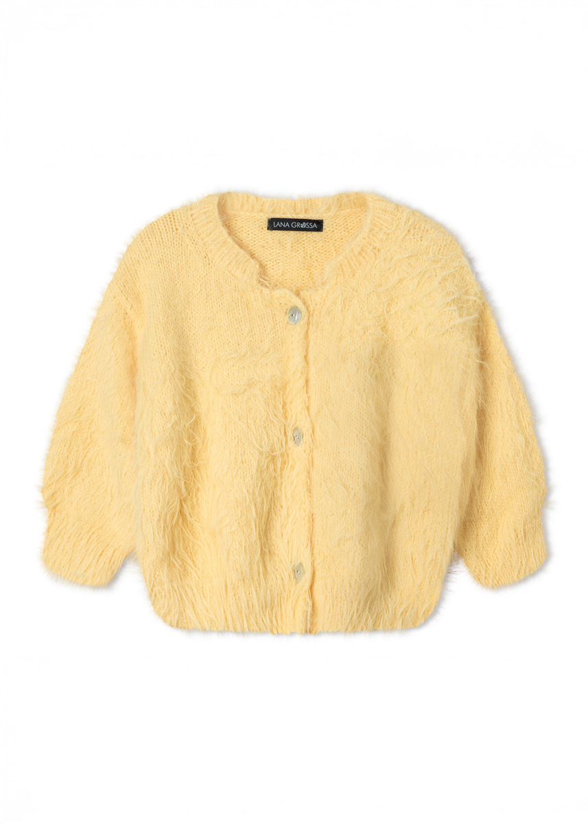 Lana Grossa-garen ‘Basta’ (50% scheerwol (merino), 50% polyamide, ca. 100 m/50 g): 350 (350 - 400 - 450) g vanille (kl 32); breinld 4 mm en 5; 3 (4 - 4 - 4) parelmoeren knopen, doorsnee 20 mm.