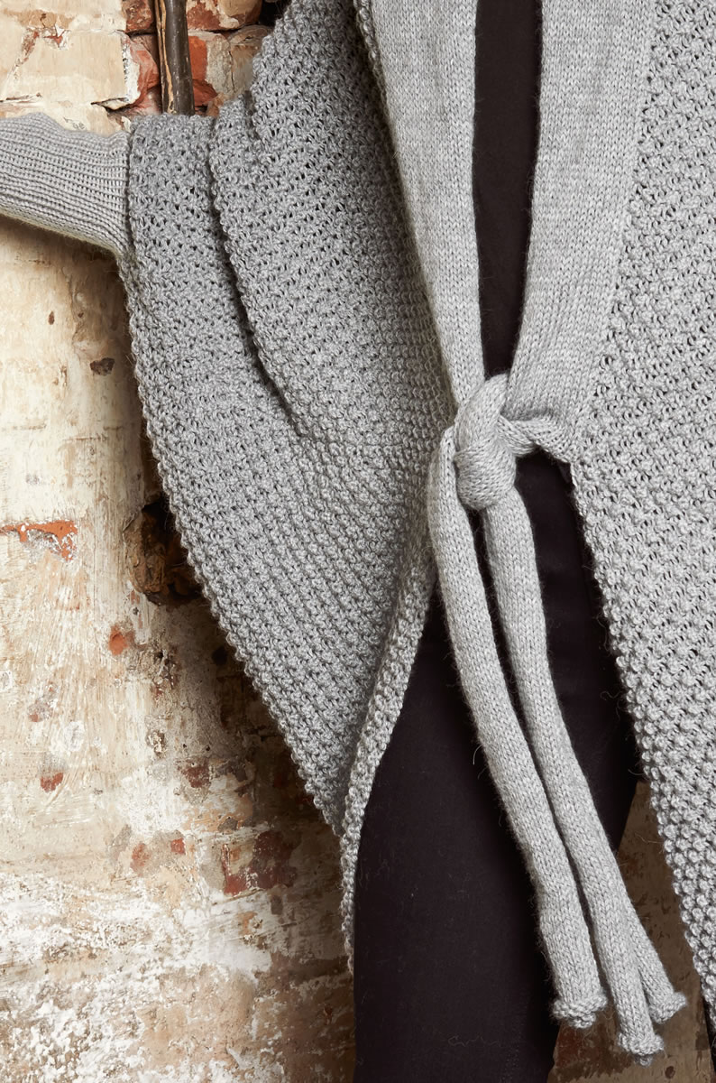 “Cool Wool Alpaca” (70% scheerwol (merinoswol extrafijn), 30% baby alpaca, ll. = 140 m/50 g) van Lana Grossa: ca. 750 g lichtgrijs (kl. 7); breinld. nr. 5; 1 set met 5 breinld. zonder knop nr. 4.