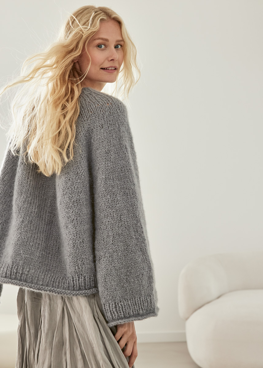 Lana Grossa Mohair di Gio (55% mohair (superkid), 45% scheerwol (merino superfijn), ca. 85 m /50 g): 450 (500 / 550 / 600) g grijs (kl 15); 1 rondbreinld 5 mm en 7 mm, 80 – 100 cm lang (als de omvang vrij klein is volgens de magic-loop-methode br of met een heel korte rondbreinld 5 mm br); 6 markeerringen, daarvan een in een andere vorm of kleur, om het begin van de toer aan te geven; 5 parelmoeren knopen met 23 mm Ø.