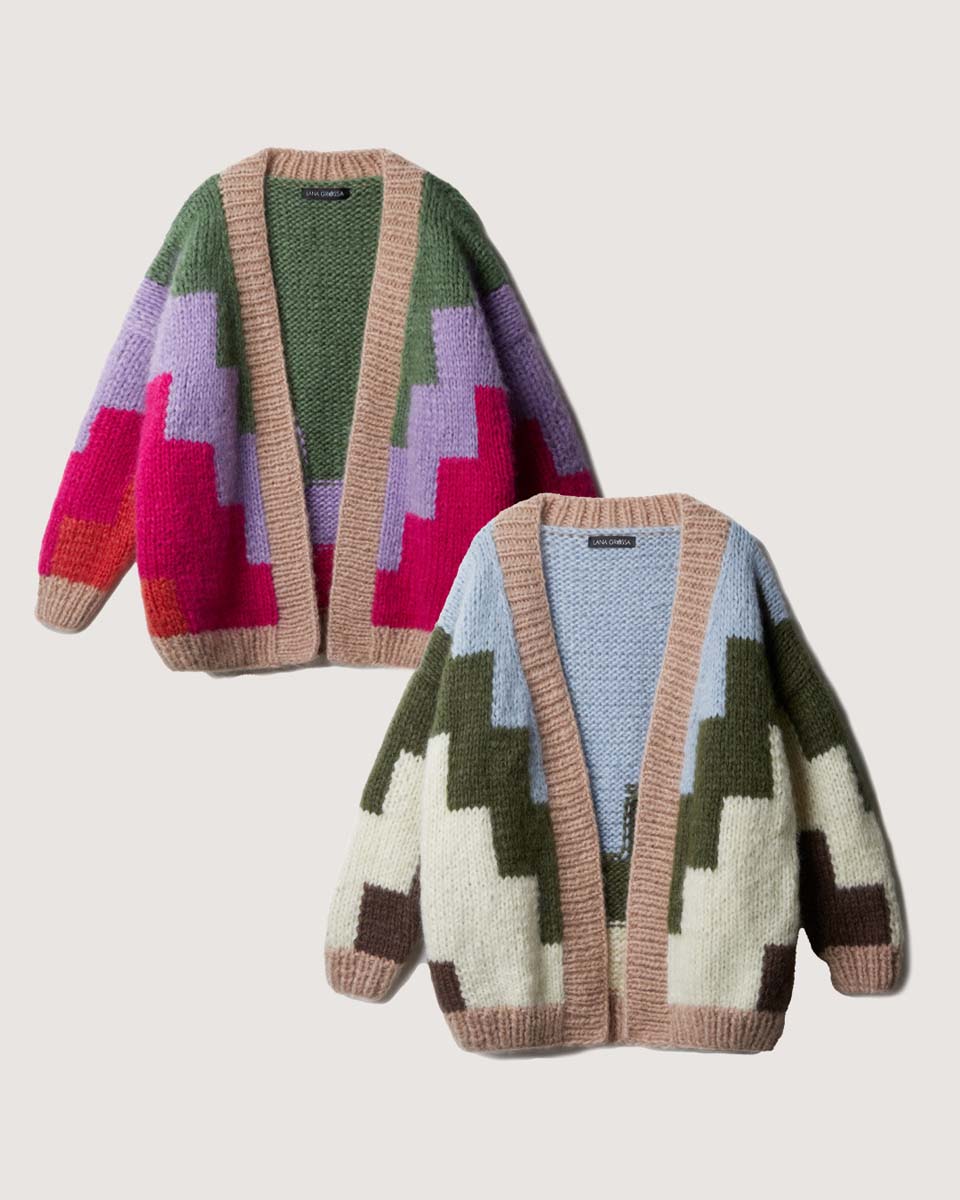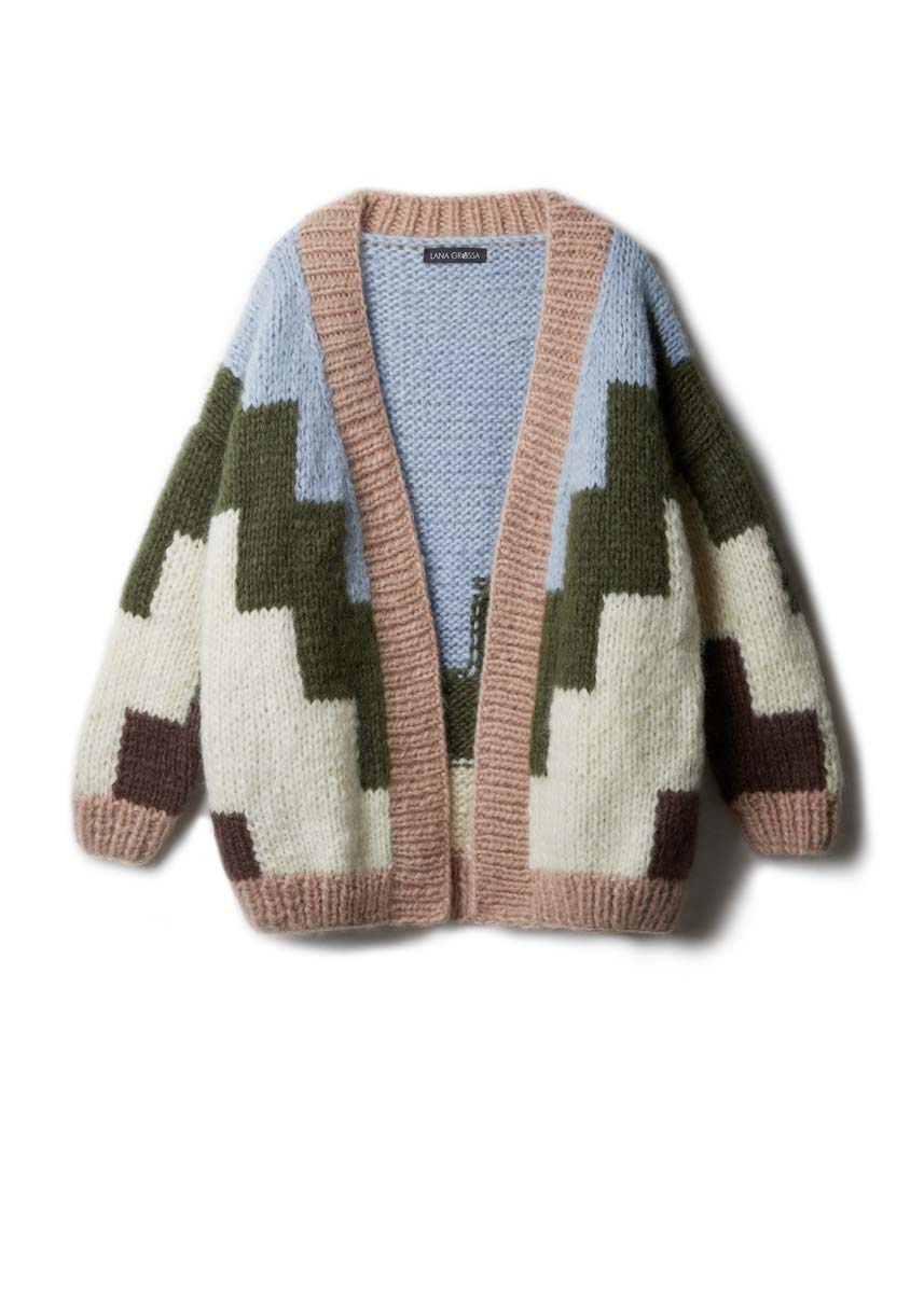 Lana Grossa Mohair di Gio (55% mohair (superkid), 45% scheerwol (merino superfijn), ca. 85 m/50 g), 300 (350 - 400) g gebroken wit (kl 9), 200 (250 - 250) g in pastelblauw (kl 10), 200 (200 - 250) g beige (kl 8) en in vaarngroen (kl 14), 100 g grijsbruin (kl 7)6); breinld 8 mm en 10 mm; een lange rondbreinld 8 mm (voor de voorste bies).