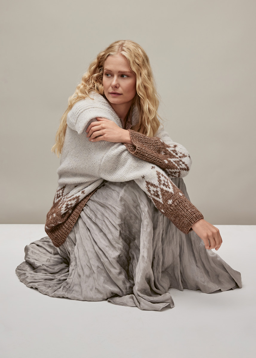 Lana Grossa Natural Alpaca Pelo (63% katoen, 31% alpaca (baby), 6% scheerwol (merino), ca. 125 m /50 g): 400 (450 / 500 / 500) g gebroken wit/lichtgrijs (kl 36) en 200 (250 / 250 / 250) g donkerbruin gemêleerd (kl 8) en Lana Grossa Glamour (55% polyamide, 45% polyester, ca. 115 m / 25 g): 25 g mokkabruin (kl 14); 1 rondbreinld 4 mm en 5,5 mm, 80 – 100 cm lang; breinld zonder knop 5,5 mm; 3 houten knopen met 25 mm Ø.