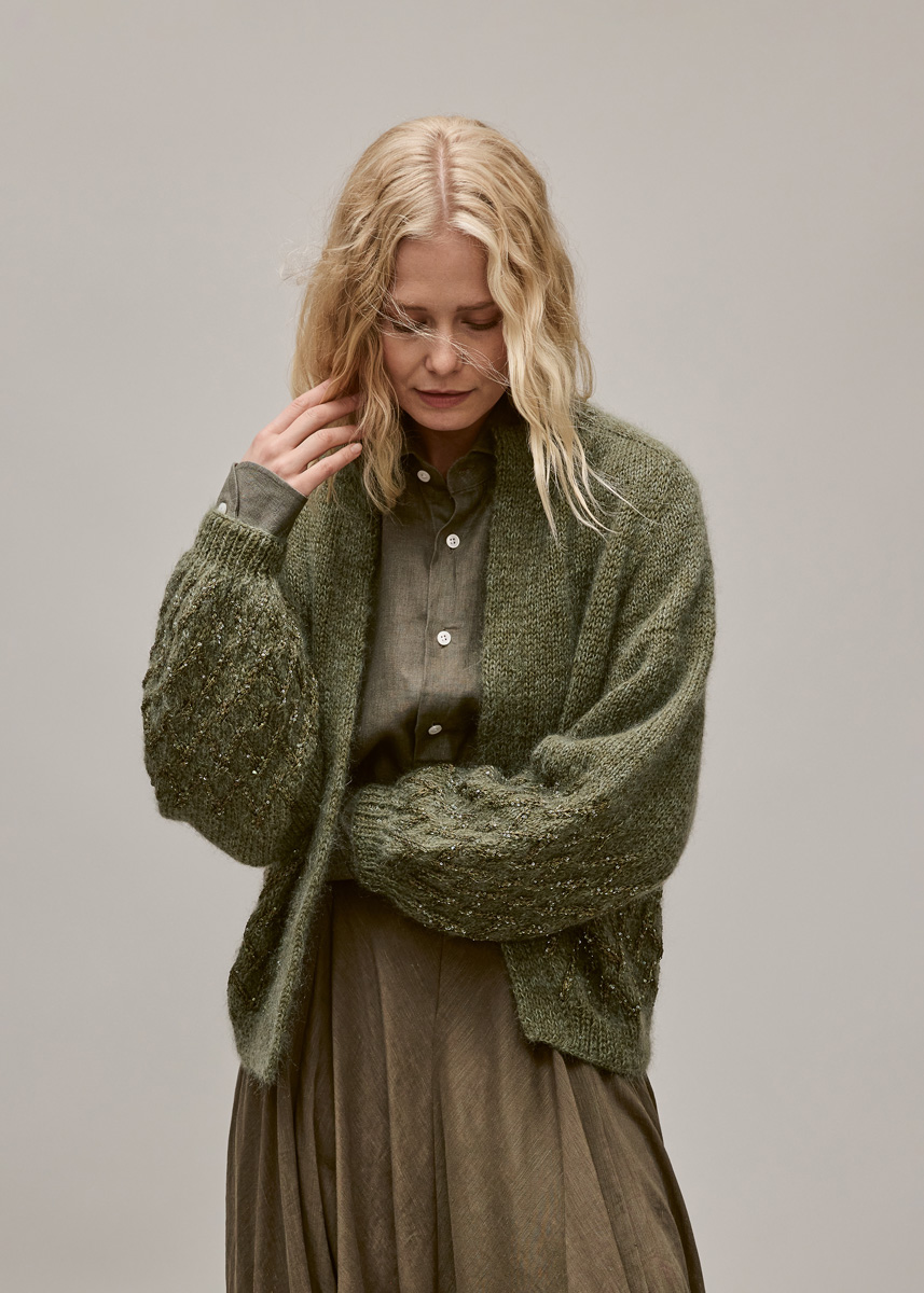 Lana Grossa Natural Lama Fine (100% lama (baby), ca. 150 m /50 g): 350 g olijfgroen (kl 119), Lana Grossa Silkhair (70% mohair (superkid), 30% zijde, ca. 210 m/25 g: 125 g mosgroen (kl 127) en Lana Grossa Glamour (55% polyamide, 45% polyester, ca. 115 m / 25 g): 200 g olijf (kl 17); 1 rondbreinld 3,5 mm en 4,5 mm, 80 – 100 cm lang (als de omvang vrij klein is volgens de magic-loop-methode br of met een heel korte rondbreinld 3,5 mm en 4,5 mm br); kabelnaald; 4 markeerringen