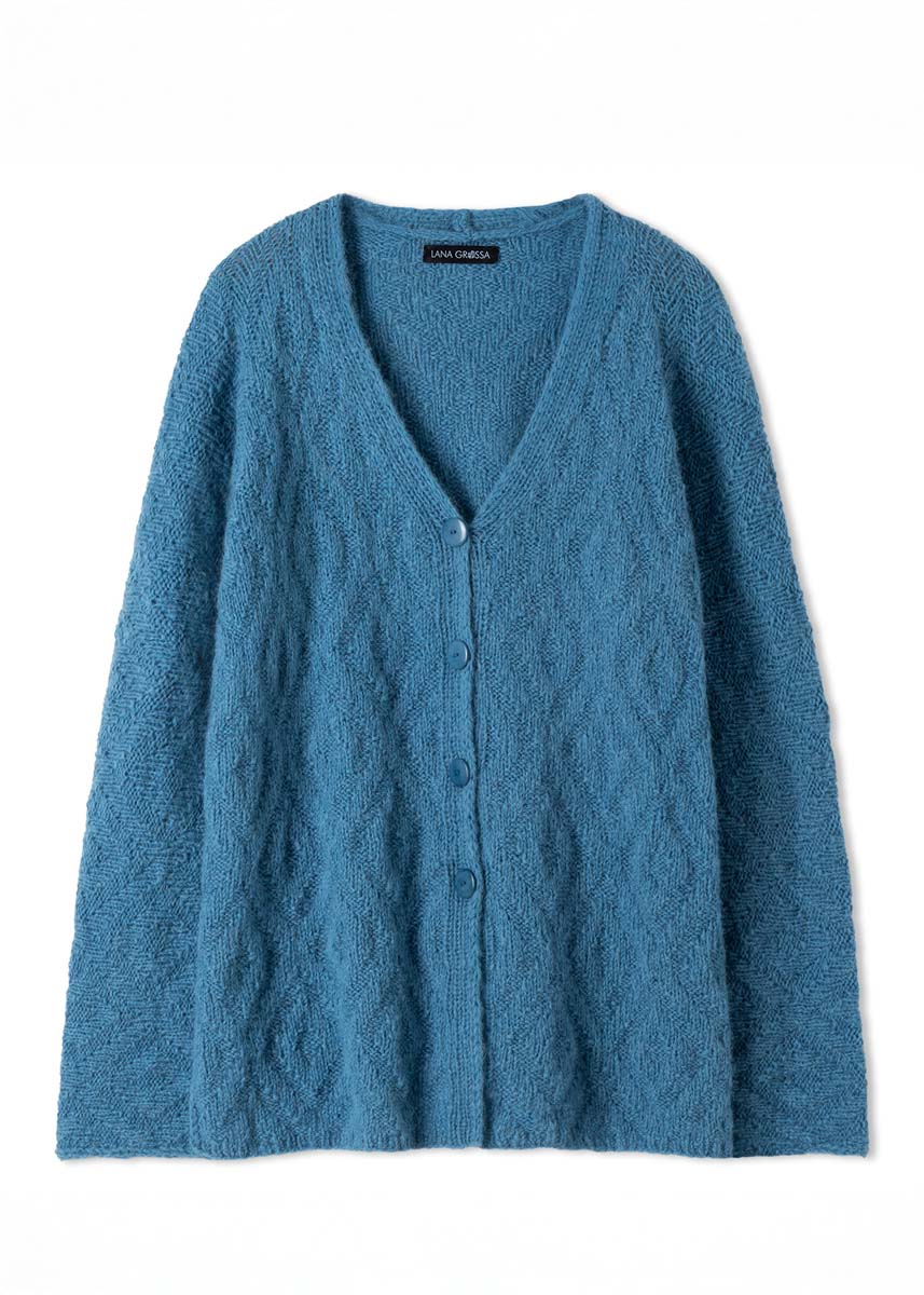Lana Grossa Nebbia (55% scheerwol (merino extrafijn), 45% (baby) alpaca, ca. 170 m/50 g), 400 g duifblauw (kl 5); breinld 5 mm; 1 rondbreinld 5 mm, 120 cm lang; 4 blauwe knopen van Union Knopf, 25 mm Ø, art. 454233, kl 64