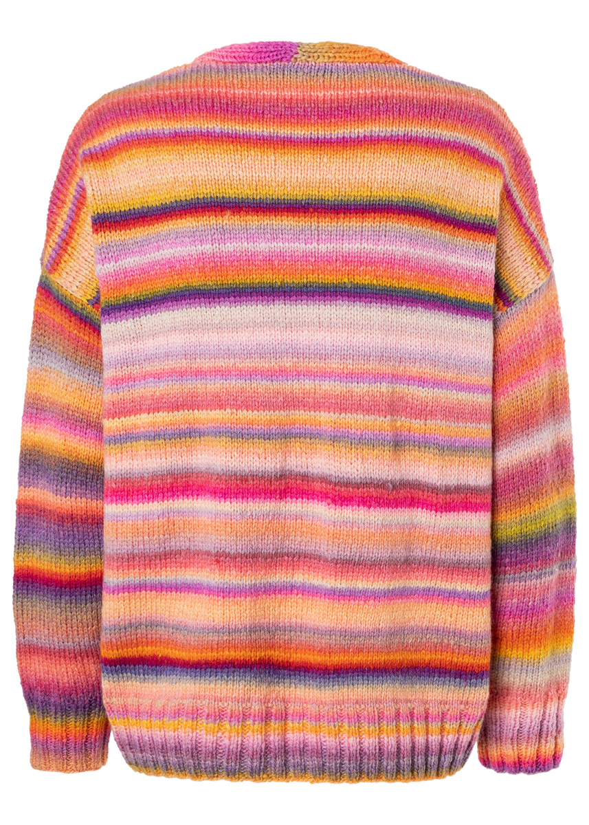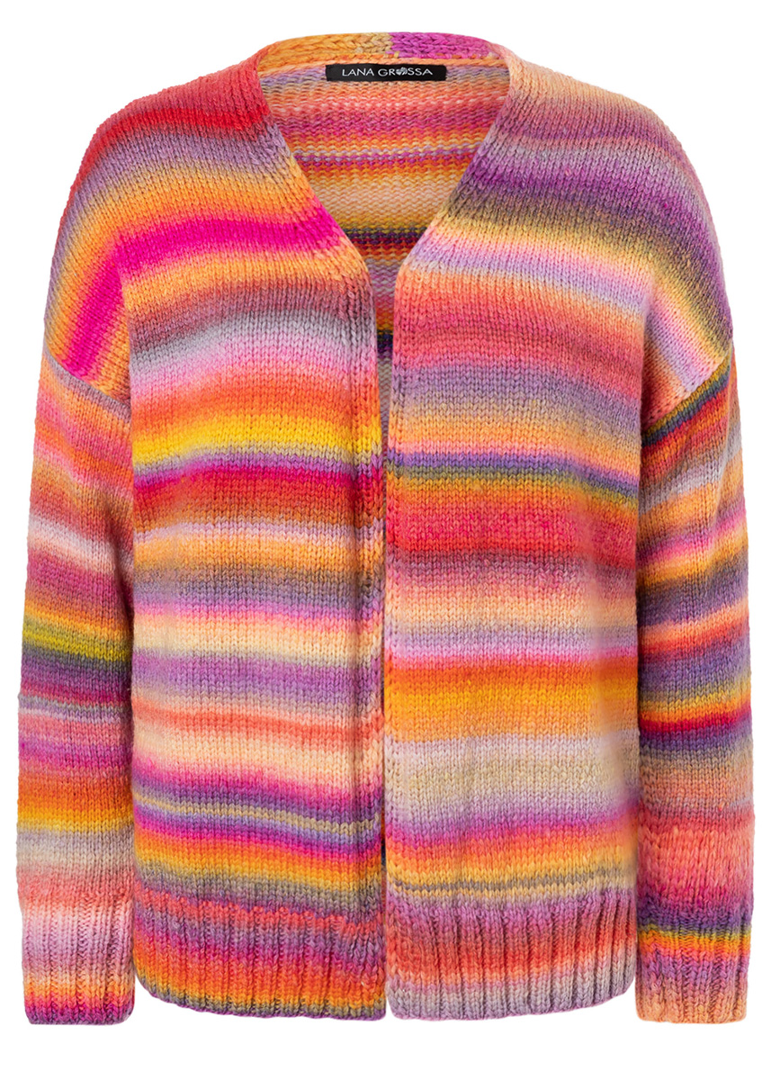 Lana Grossa “Pappagallo” (90% scheerwol (merinoswol extrafijn), 10% polyamide, looplengte 250 m/100 g), 600 (600 – 700) g fuchsia/roze/zalmroze/lichtgrijs/sering/ oranje/geel/blauwpaars/rood/donkerrood (kl. 4); breinaalden nr. 4,5