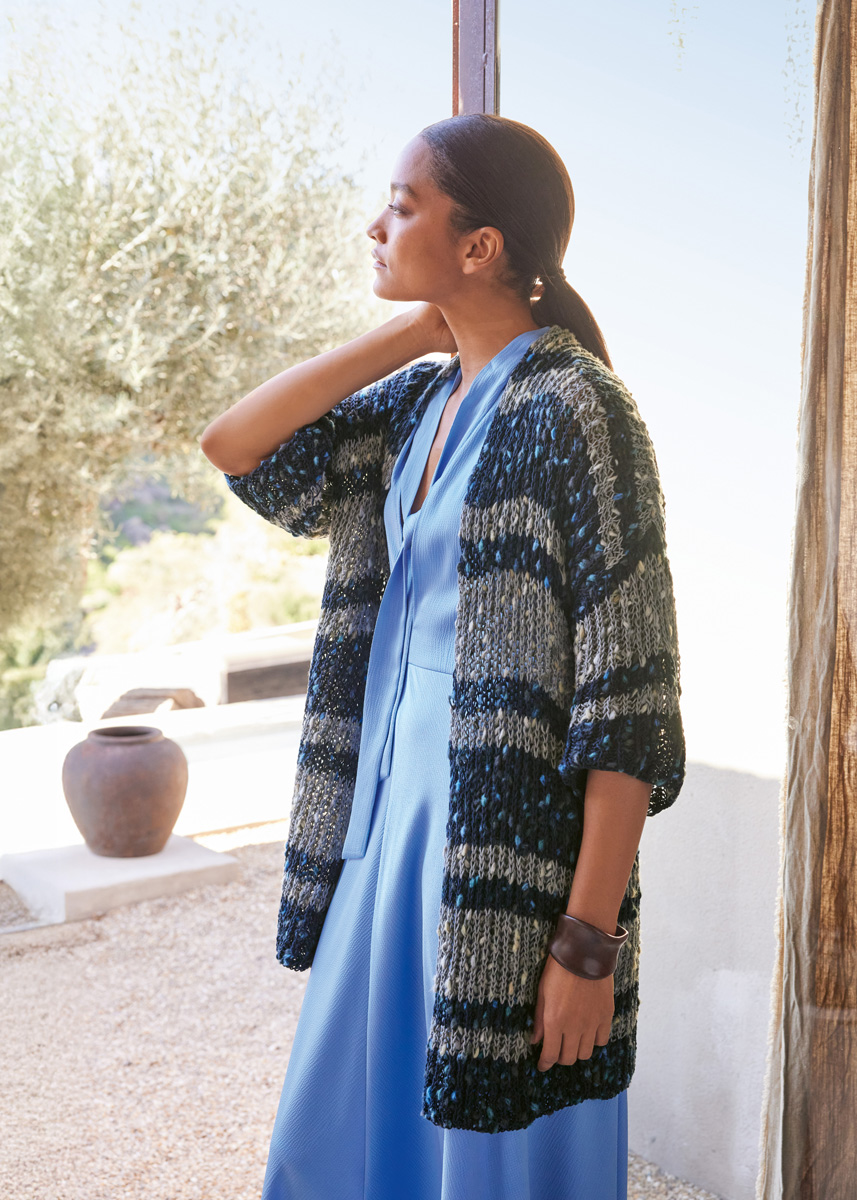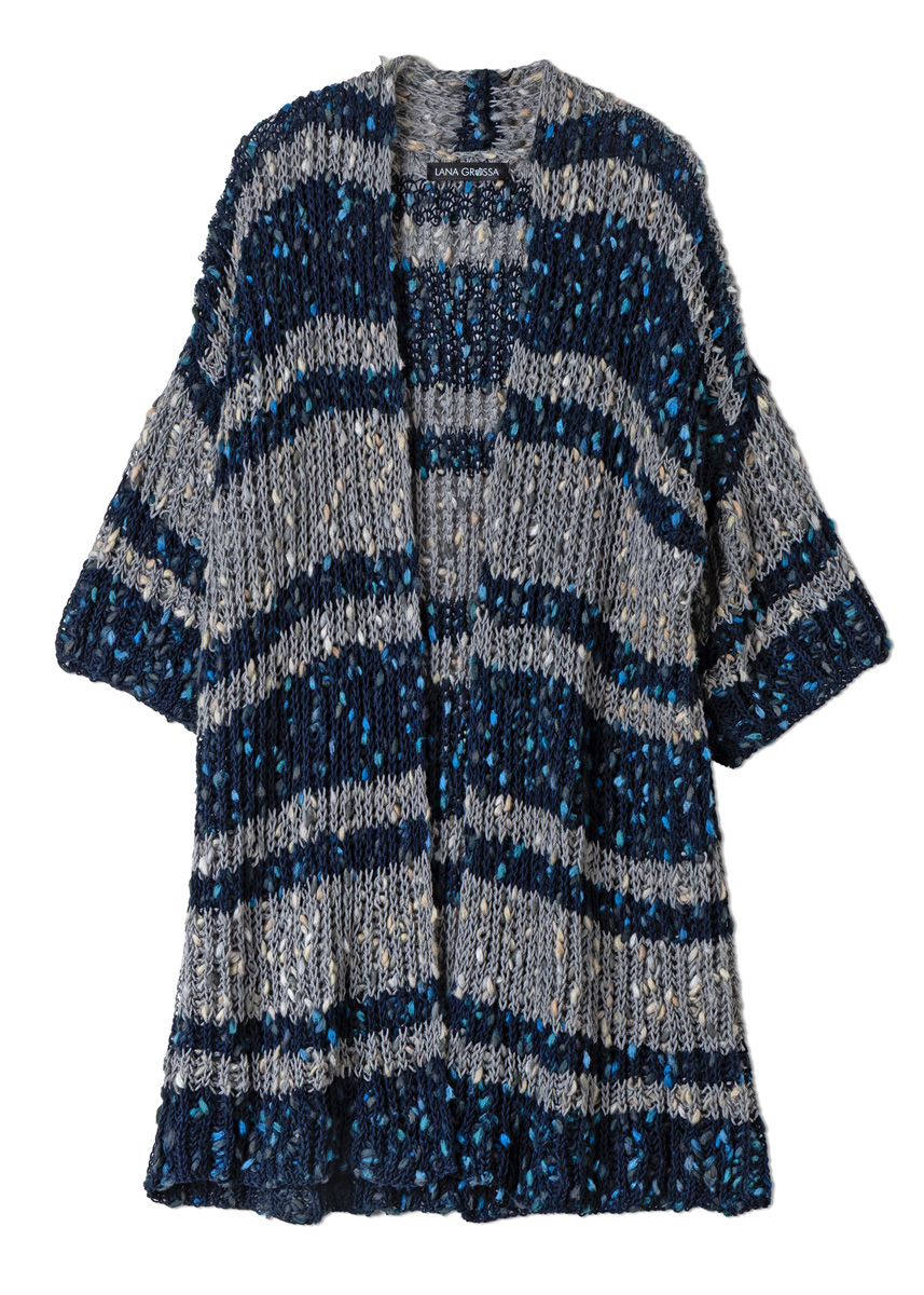 Lana Grossa Popcorn (100% katoen, ca. 125 m/50 g), 250 (250 - 300) g in nachtblauw/lichtblauw/donkerblauw/ turquois (kl 7) en in grijs/beige/greige/camel (kl 11). Breinld 7 mm.