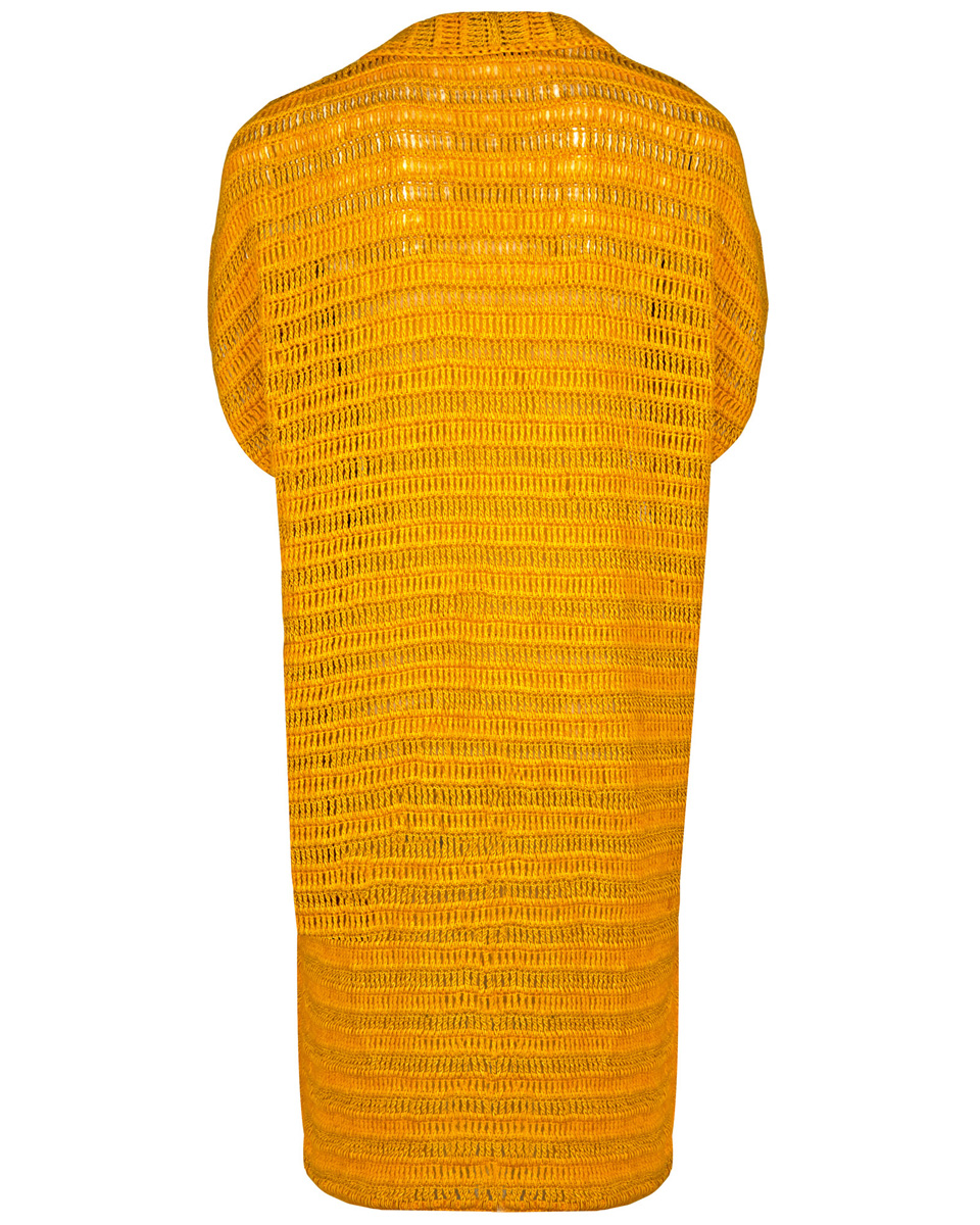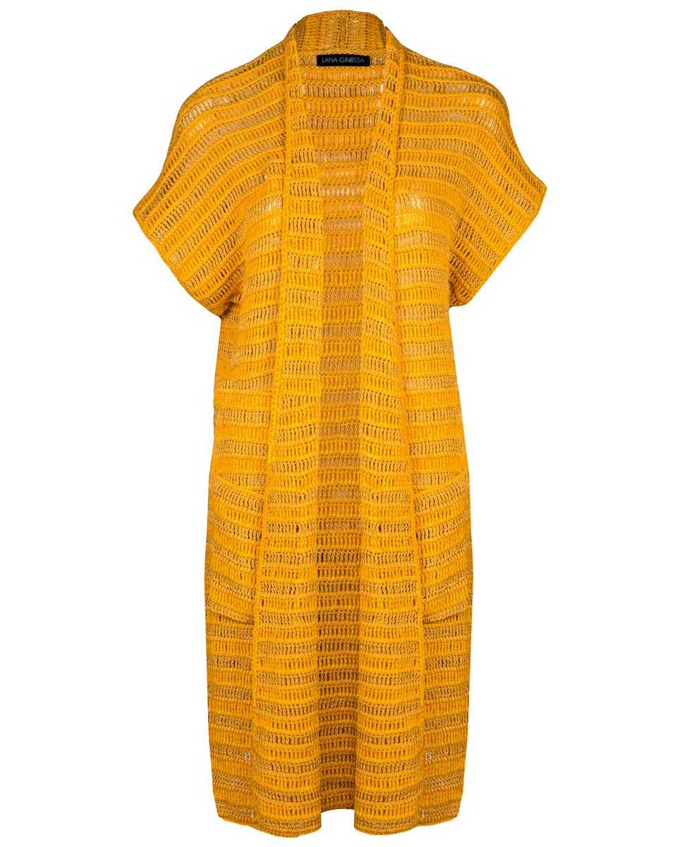 Lana Grossa Solo Lino (80% gerecycled linnen (viscose), 20% linnen, looplengte 120 m/50 g), 500 (550 – 600) g zonnegeel (kl. 15) en Lana Grossa Ecopuno (72% katoen, 17% scheerwol merino, 11% baby alpaca, looplengte 215 m/50 g), 300 (350 - 400) g geel (kl. 4); 1 haaknaald nr. 3