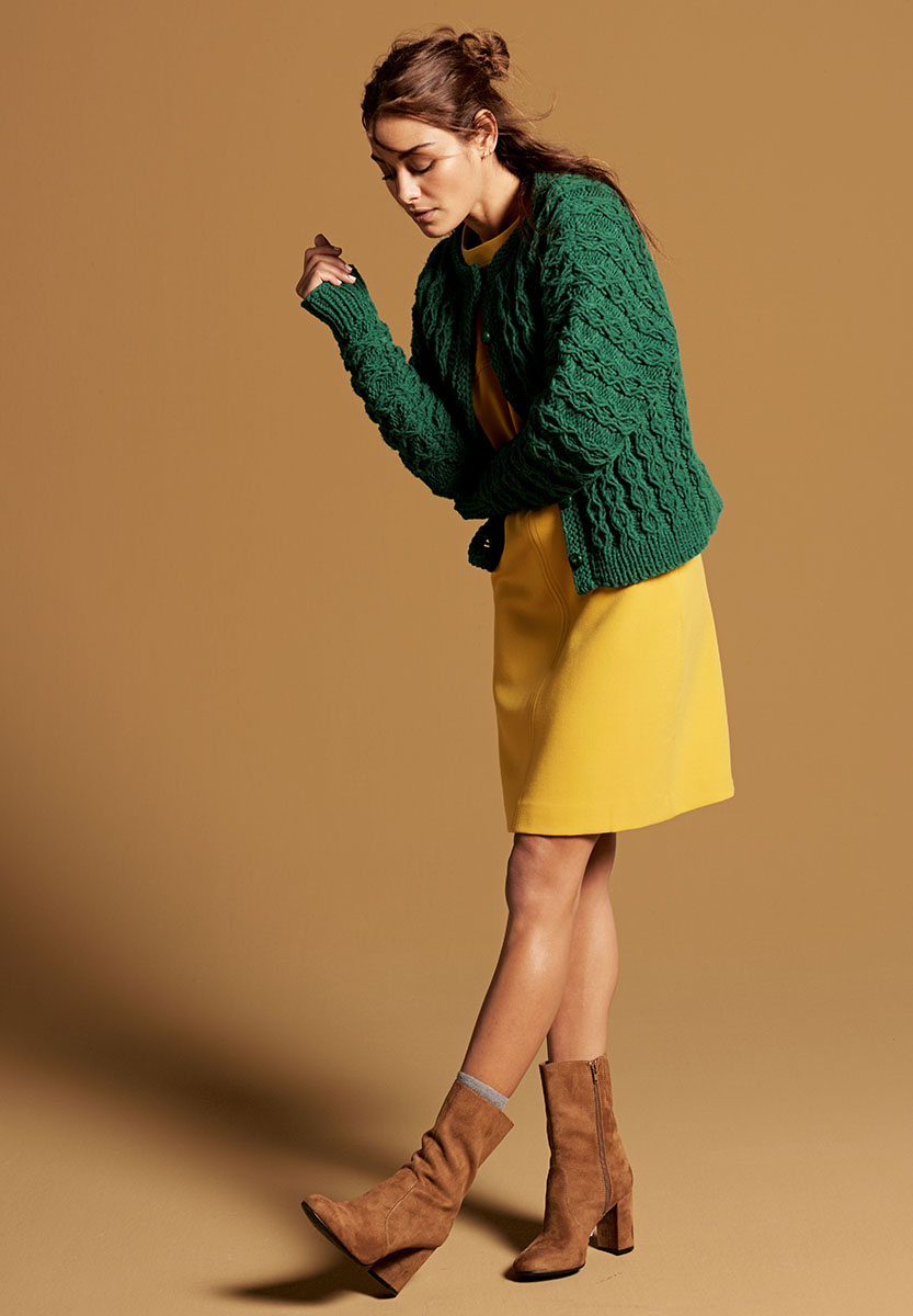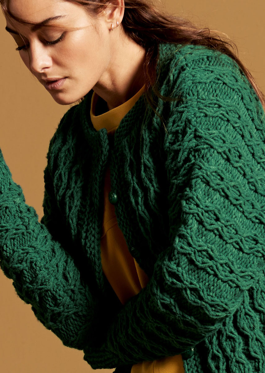 Wanneer de temperaturen gaan zinken is dit groene, met aranpatronen versierde vest onze beste vriend. Het bestaat uit drie delen, is prima om mee te combineren en laat u er goed gekleed uitzien.