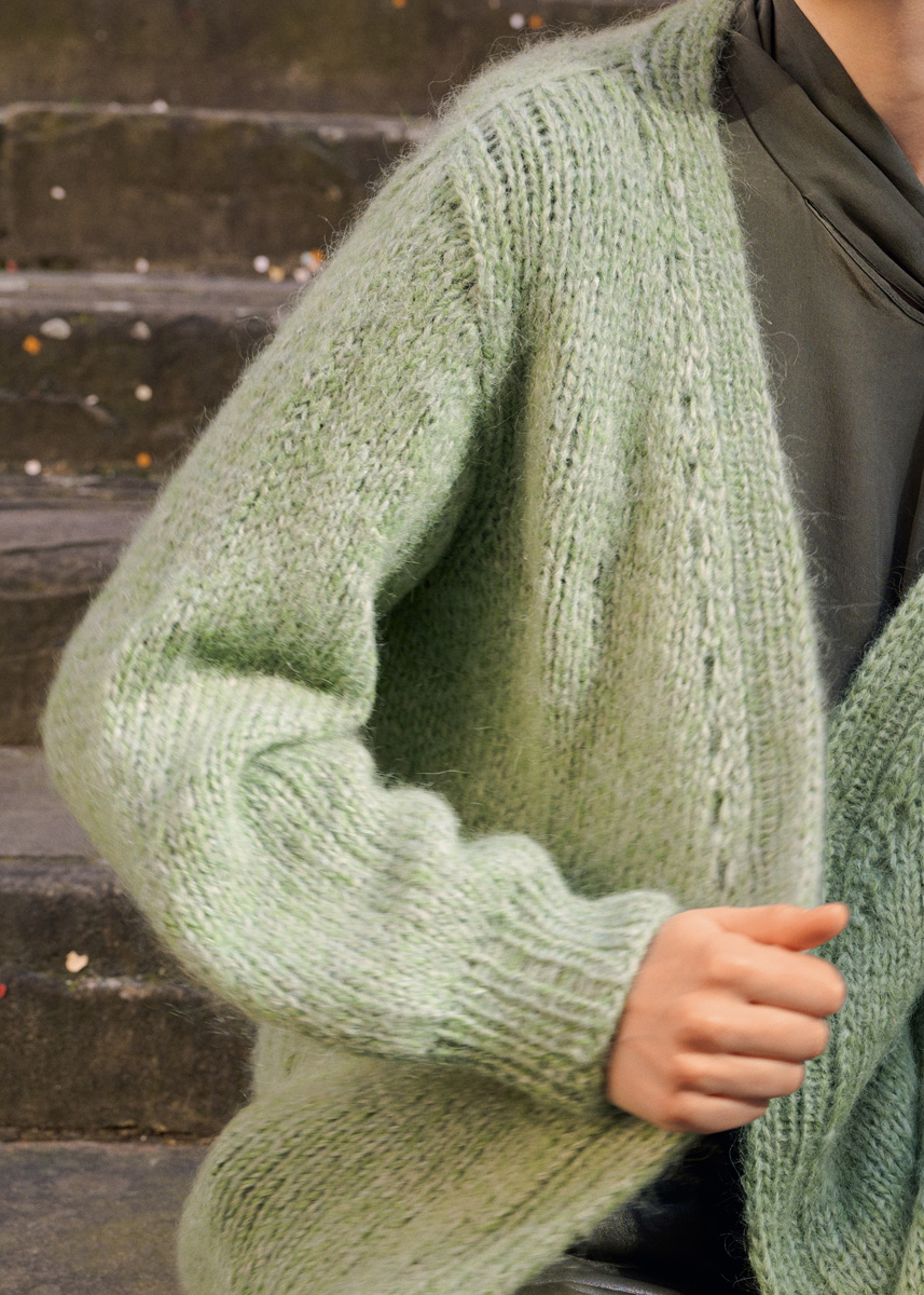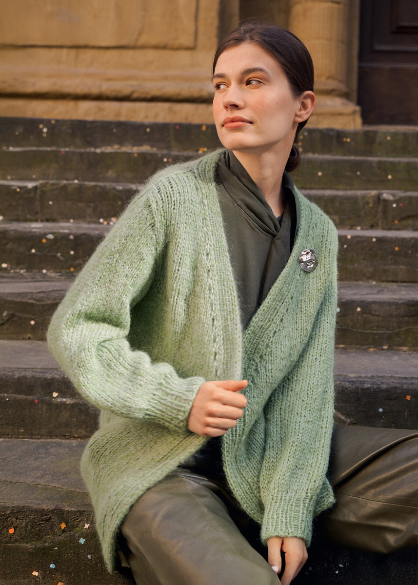 Lana Grossa-garen ‘Superkid Seta’ (65% mohair (superkid), 35% zijde, ca. 100 m/25 g): ca. 200 (225 - 250 - 275) g grijsgroen (kl 17); Lana Grossa-garen ‘Setasuri’ (69% alpaca (suri), 31% zijde, ca. 212 m/25 g): ca. 100 (125 - 125 - 150) g appelgroen (kl 72) en ca. 100 (125 - 125 - 150) g licht zeegroen (kl 41); lange rondbreinld 5 mm, 6,5 mm en 8 mm; korte rondbreinld 8 mm; breinld zonder knop 6,5 mm.