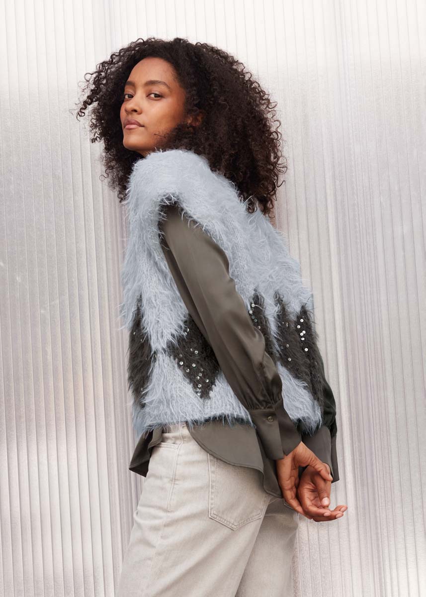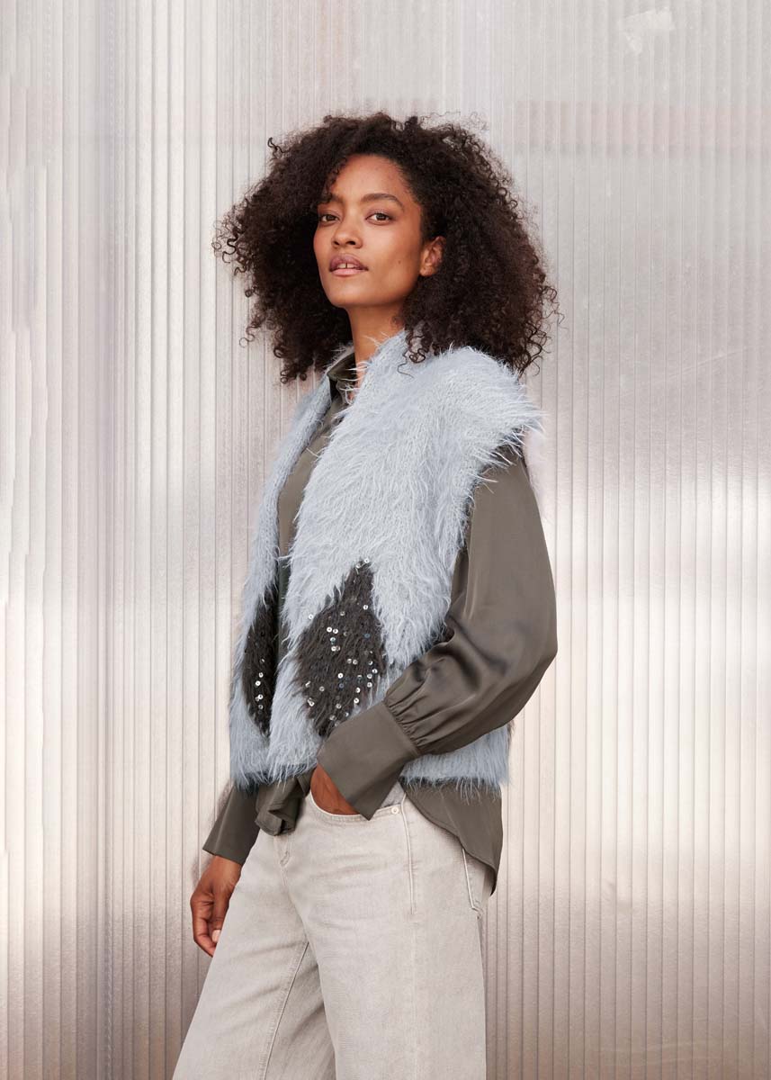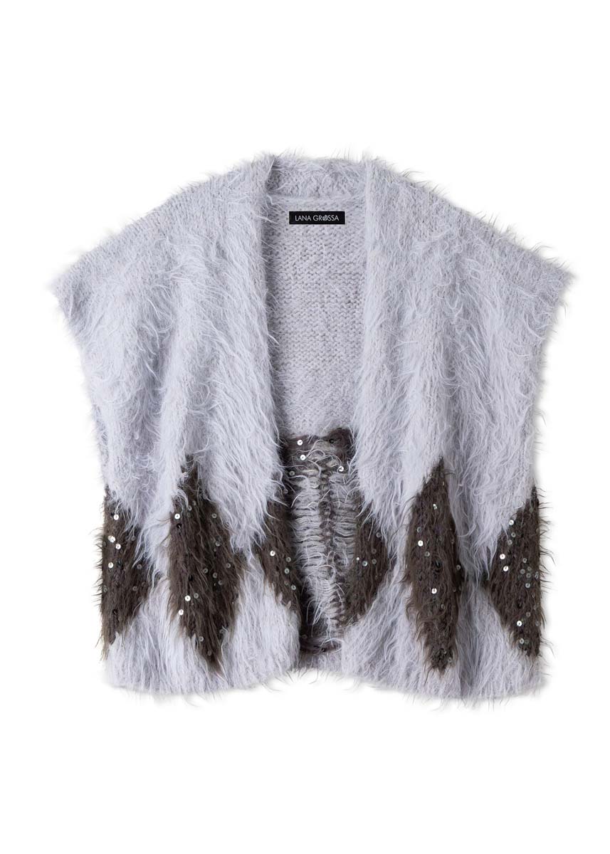 Lana Grossa Ecopuno (72% katoen, 17% scheerwol (merino), 11% alpaca (baby), ca. 215 m/50 g), 100 (150) g zilvergrijs (kl 45) en Lana Grossa Basta (50% scheerwol (merino), 50% polyamide, ca. 100 m/50 g), 250 (300) g zilvergrijs (kl 4) en 100 g grijsbruin (kl 34) en Lana Grossa Cosmo (100% katoen (+ pailletten), ca. 260 m/100 g), 100 g grijs (kl 3); breinld 7 mm. 4 hulpnld.