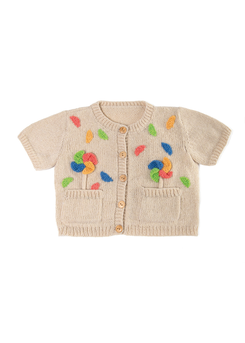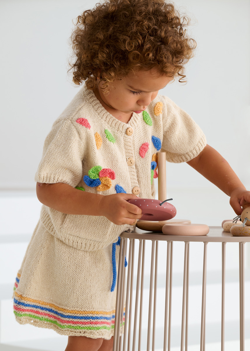 Lana Grossa Ecopuno (72% katoen, 17% scheerwol (merino), 11% alpaca (baby); ca. 215 m/50 g): 100 (100/100/150) g parelbeige (kl 66) en 50 g lentegroen (kl 215), gentiaanblauw (kl 213), kreeftrood (kl 90) en saffraangeel (kl 216); rondbreinld 3,5 mm en 4 mm; haaknld 3 mm; markeerringen; 5 knopen met 18 mm Ø.