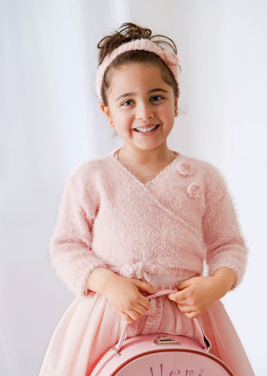 La première position, nee, la quatrième position … voor de spiegel staan en oefenen, oefenen, oefenen! Voor een kleine ballerina hoort er naast het tulerokje zo‘n kort wikkelvestje definitief bij. En voor de haren een met bloemetje versierde hoofdband. En beenwarmers natuurlijk! Alors: pas de chat!