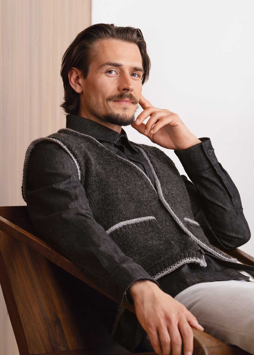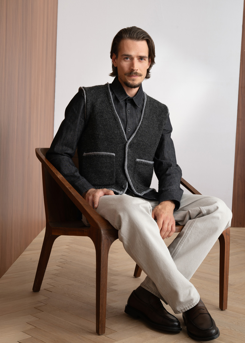 Lana Grossa Landlust Naturwolle (100% (Noorse) scheerwol, ca. 85 m/50 g), 400 (450 – 500) g antraciet (kl 10) en 50 g grijs (kl 9); breinld 5 mm, 1 rondbreinld 4,5 mm (40 en 100 cm lang), 3 knopen van UNION KNOPF, art. 451992, kl 80, Ø 18 mm.