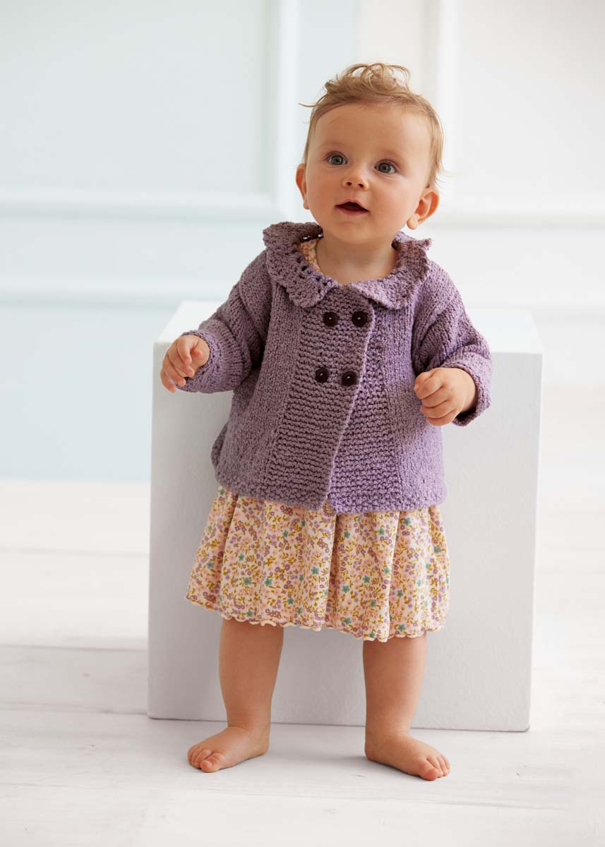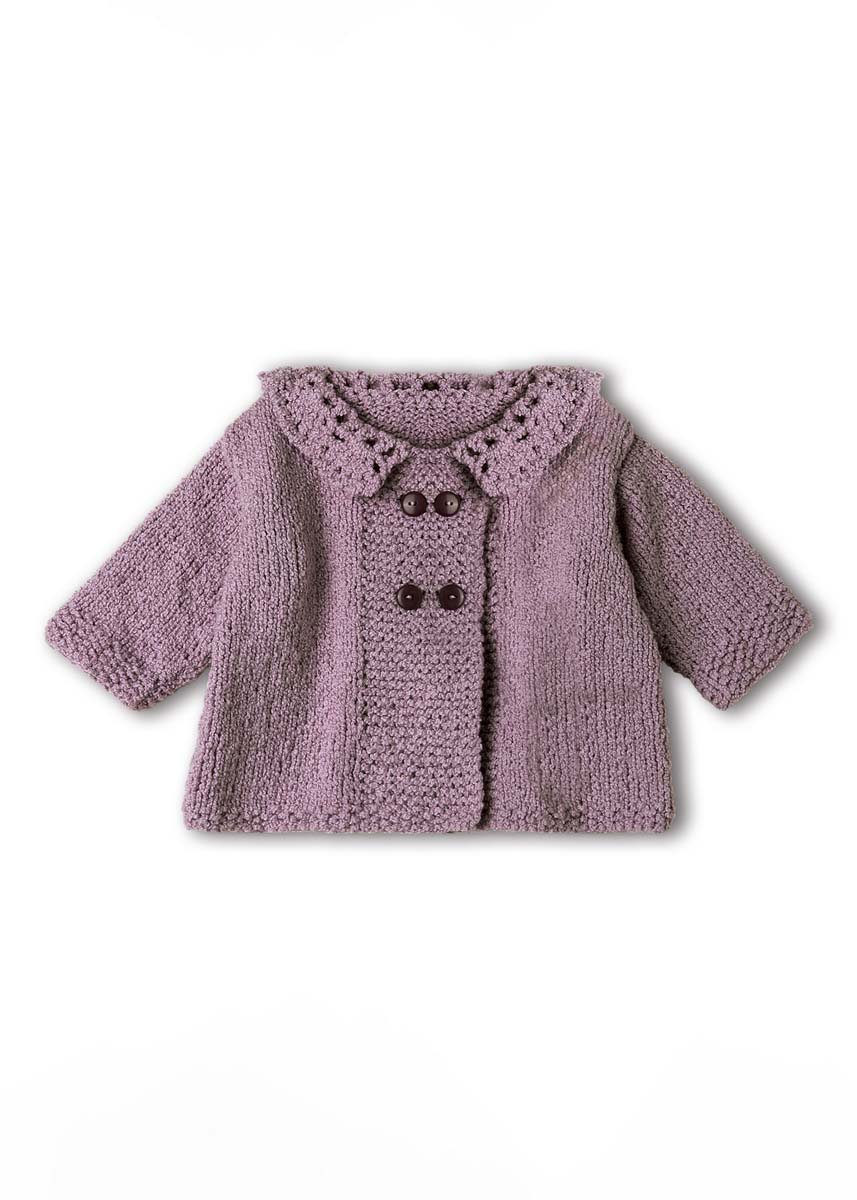 Lana Grossa Riccio (84% katoen, 16% polyamide; ca. 110 m/50 g): 100 (100/150/150) g mauve (kl 22); rondbreinld 4,5 mm; haaknld 4 mm; 4 knopen, 13 mm Ø