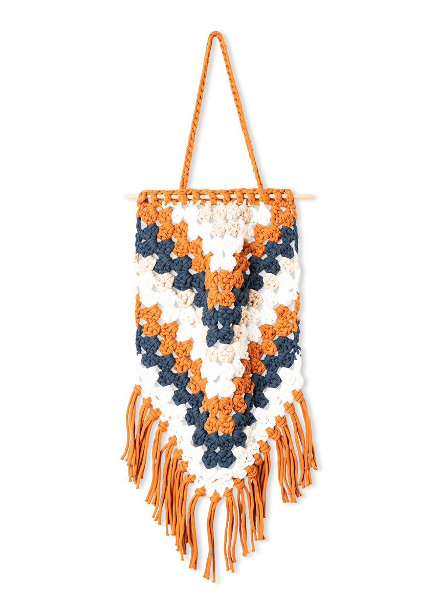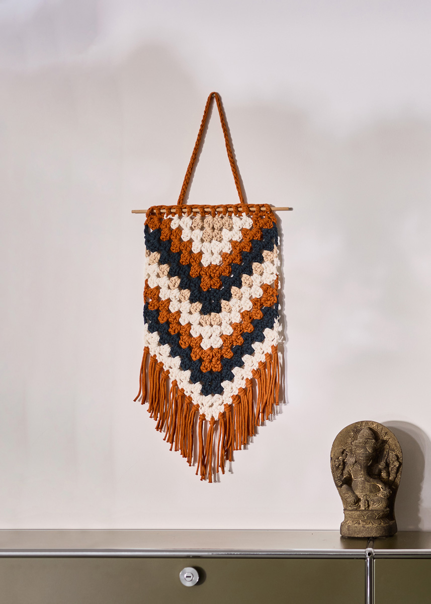 Lana Grossa-garen ‘The Tube’ (60% katoen, 40% nylon, ca. 114 m/200 g): ca. 200 g crème (kl 2), beige (kl 17), roest (kl 6) en nachtblauw (kl 21); 1 haaknld 9 mm, 1 houten stok, ø 1 cm, ca. 40 cm lang.