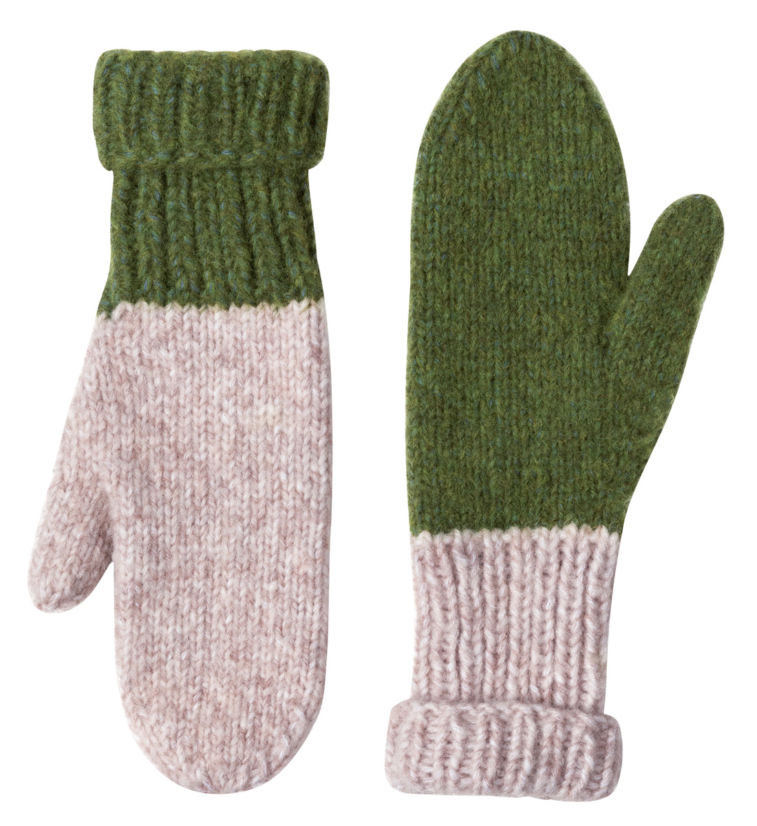 Lana Grossa-garen ‘Ecopuno Chunky’ (48% katoen, 33% scheerwol (merino extrafine), 19% (baby) alpaca, ca. 70 m/50 g): 50 g lichtbeige (kl 113), 50 g donkerolijf (kl 121), breinld zonder knop 4 mm, 2 hulpnld