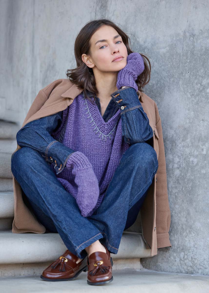 Lana Grossa-garen ‘Winter Softness’ (62% scheerwol (merino extrafijn), 38% katoen (bio), ca. 70 m/50 g): 100 g violet (kl 8); breinld zonder knop 5 mm en 6 mm, 2 veiligheidsspelden.