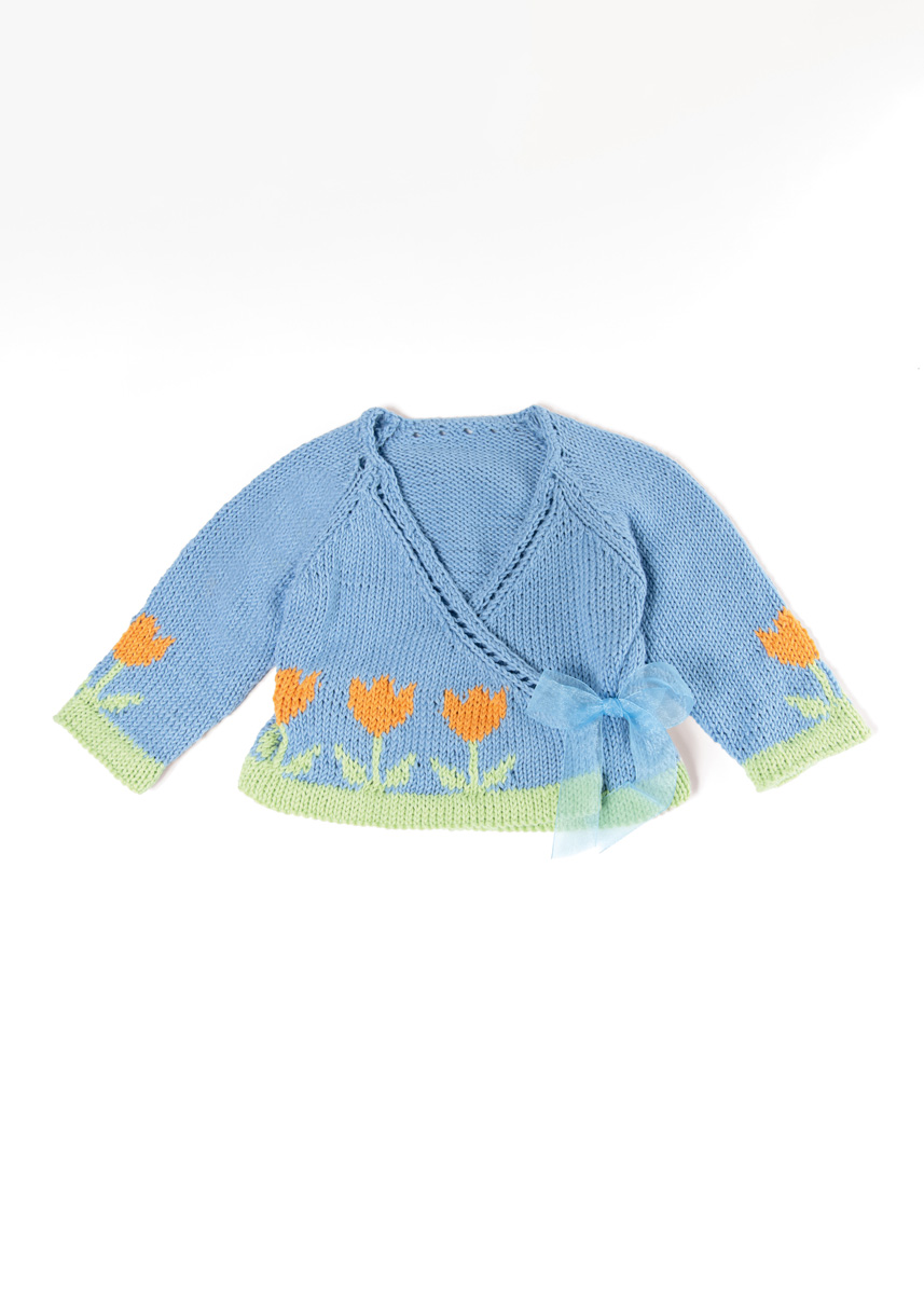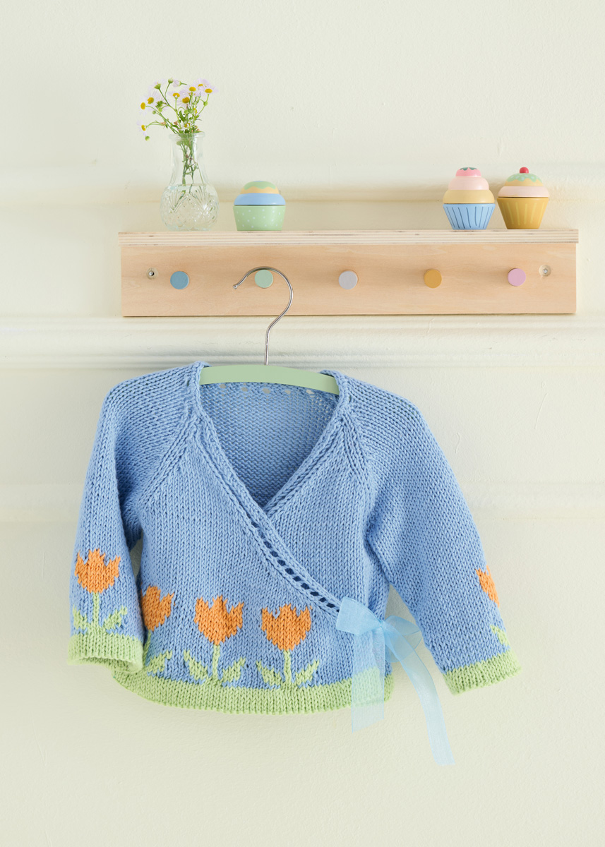 Lana Grossa Soft Cotton (70% katoen, 30% polyacryl; ca. 140 m/50 g): 100 (150/150/200) g hemelsblauw (kl 47) en 50 g lindegroen (kl 36) en oranje (kl 59); rondbreinld 3,5 mm en 4 mm; haaknld 3 mm; markeerringen (alternatief: veiligheidsspelden); 80 cm organzaband, 2,5 cm breed.