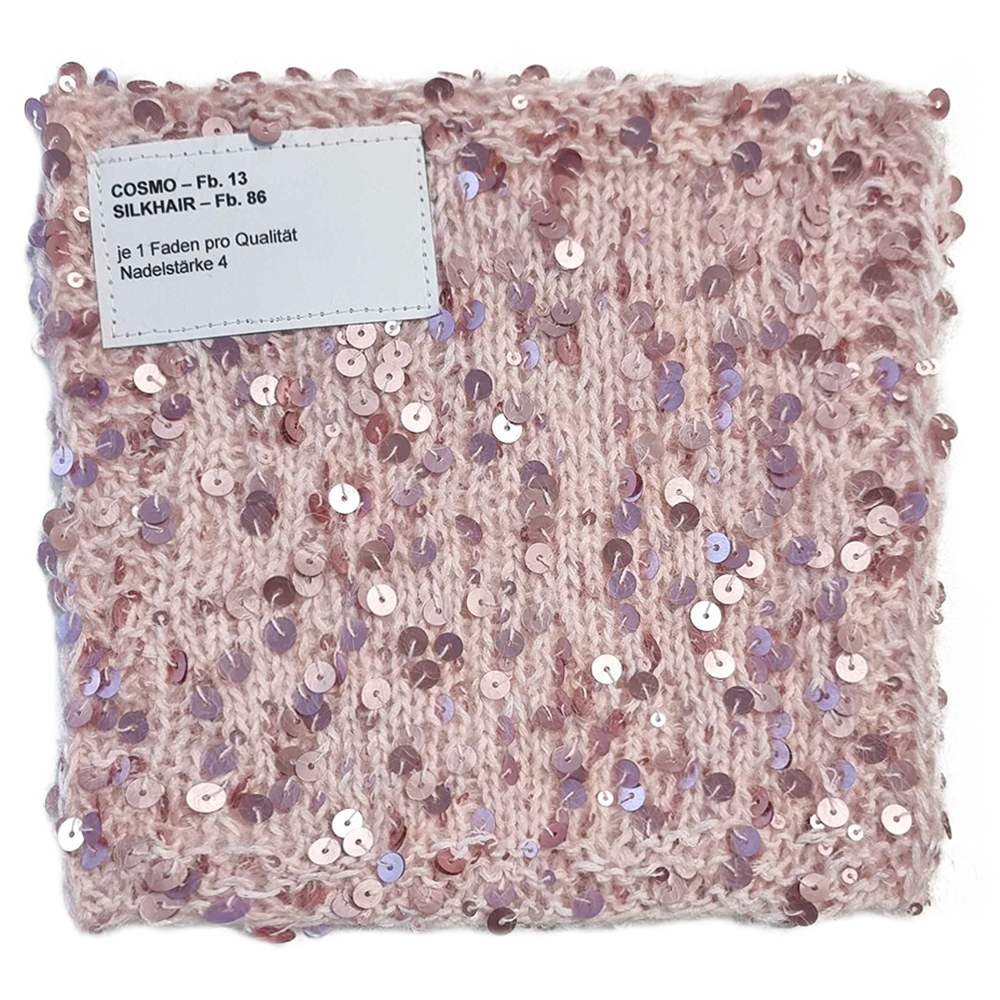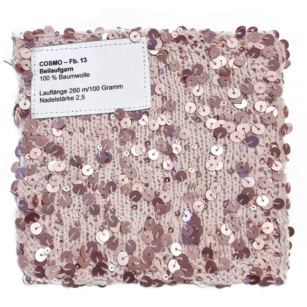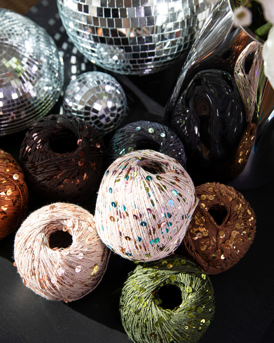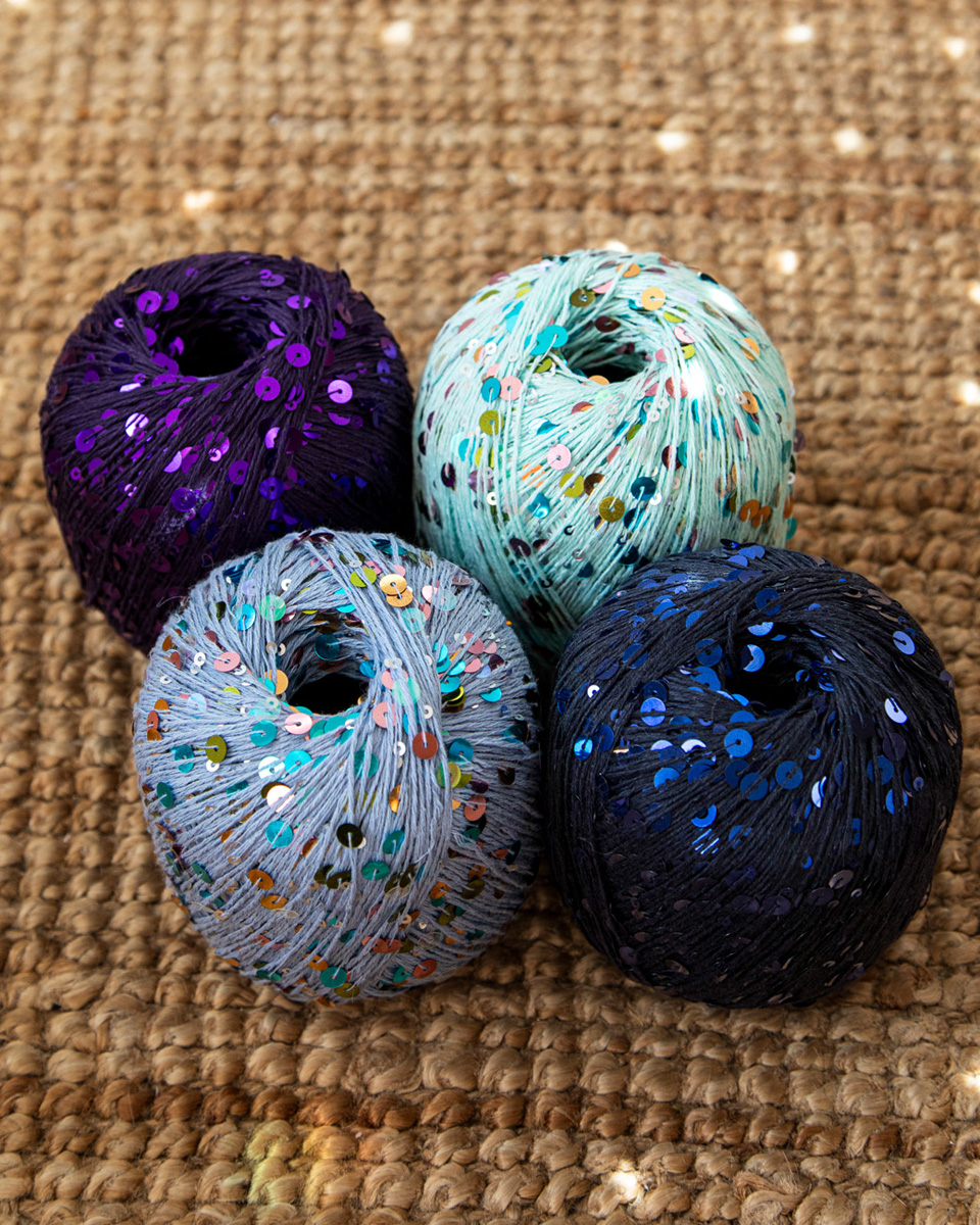 Grote en kleine pailletten, naar keuze bont of effen, gecombineerd met een katoenen dradenkern: dit meeloopgaren geeft volumineuze breisels een galactische glans.