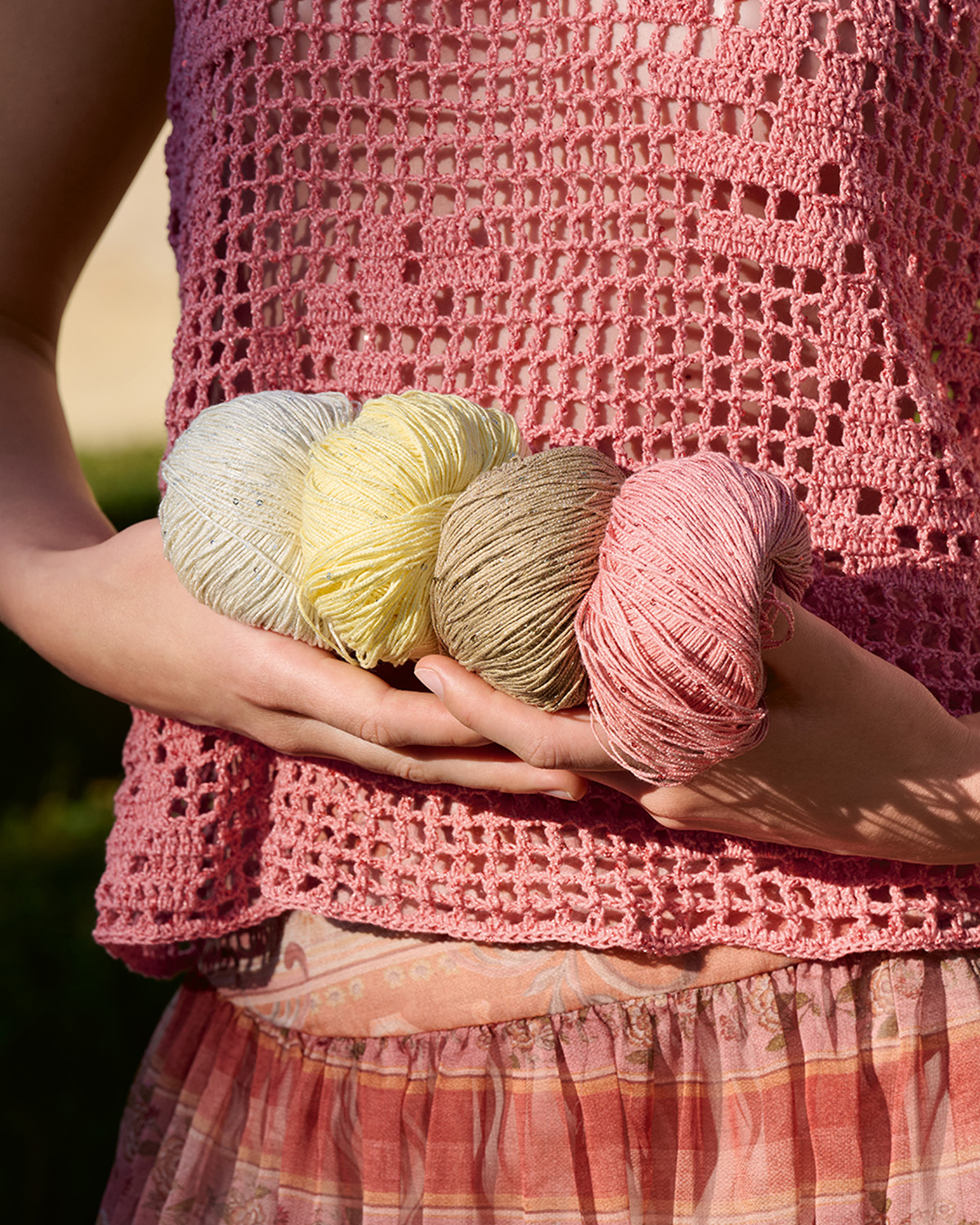 Hoogwaardige katoenen draden worden samen met een draad van minuscule pailletjes in elkaar gedraaid tot een dun garen. Door de kleurstelling worden subtiele glinsterende accenten gecreëerd.