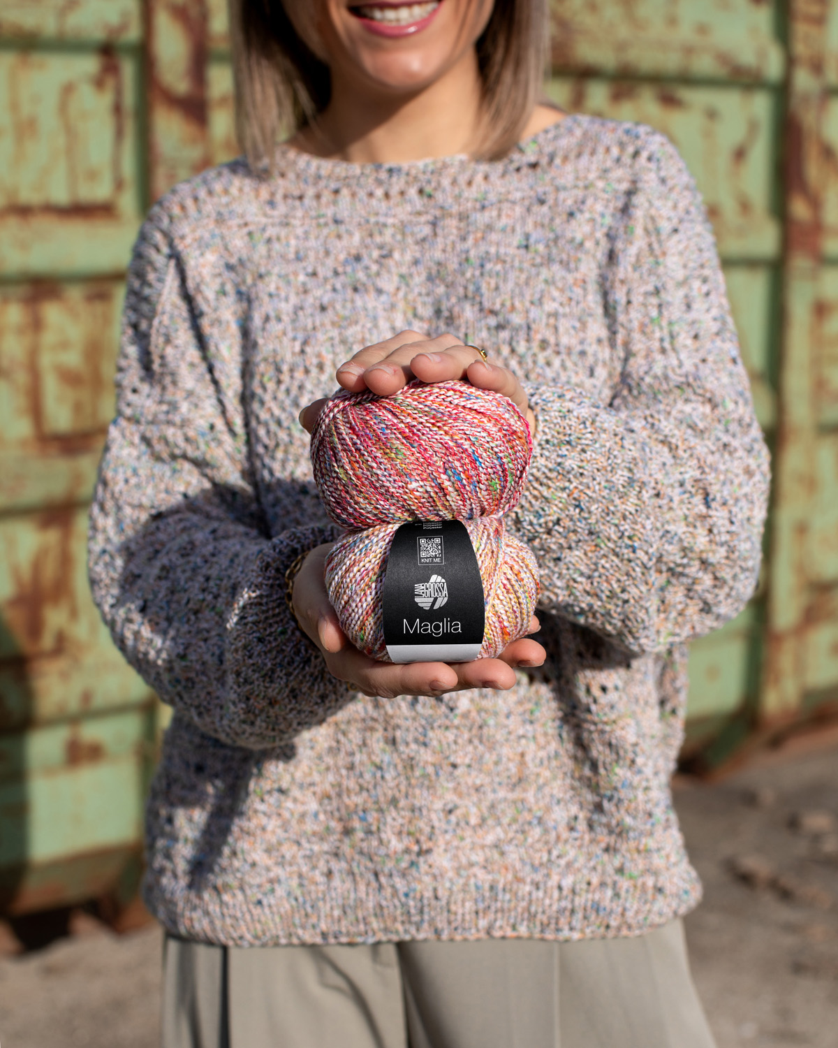 Maglia is een modern zomers tweedgaren van zachte katoen, getwijnd met een kleurrijk effectgaren. Dit zorgt voor een levendig, gestructureerd stekenbeeld met subtiele kleurnuances – perfect voor breiprojecten met een natuurlijke uitstraling en een modieuze touch. Licht, ademend en aangenaam op de huid is Maglia ideaal voor zomerse truien, tops, vesten of accessoires die overtuigen door structuur en kleur.