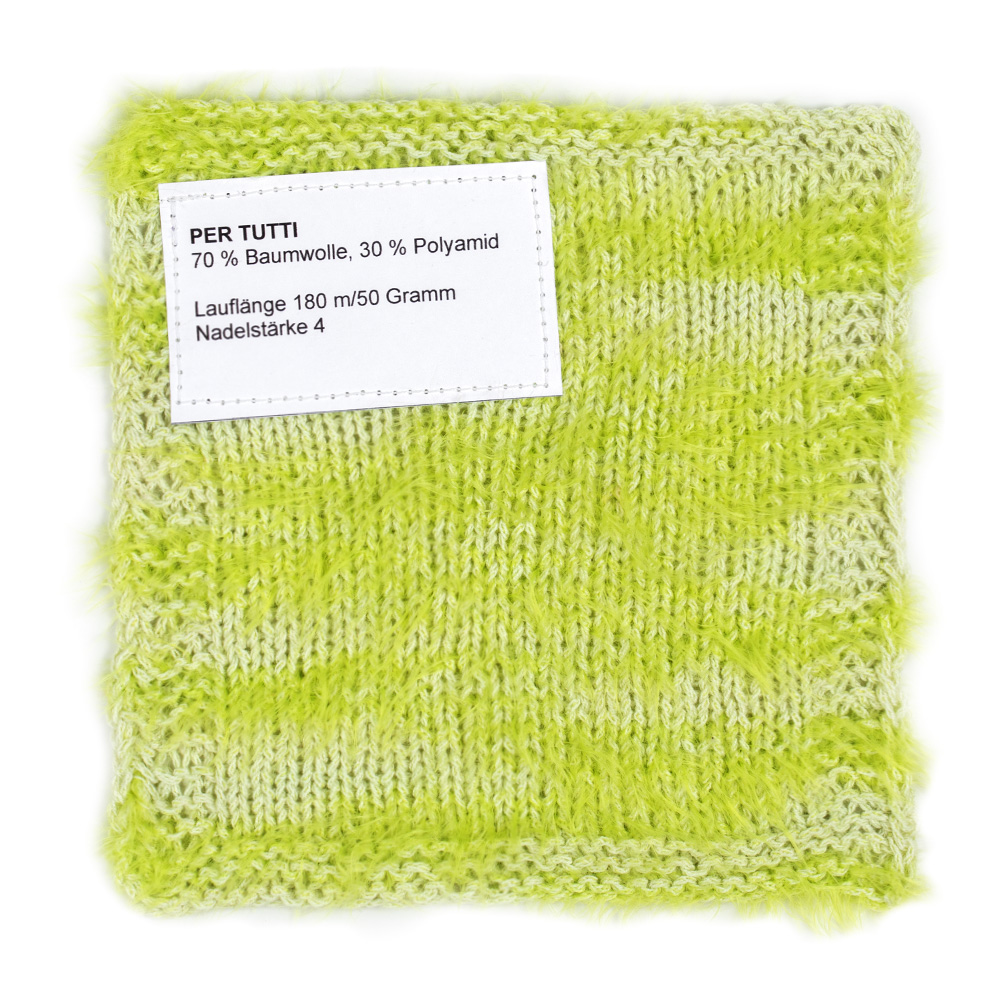 Per Tutti is een licht katoen garen met een interessante structuur en een moderne uitstraling. Gladde, subtiel glanzende delen wisselen zich af met zachte, fluffy segmenten – dit zorgt voor een levendig stekenpatroon en een bijzonder aangename touch.