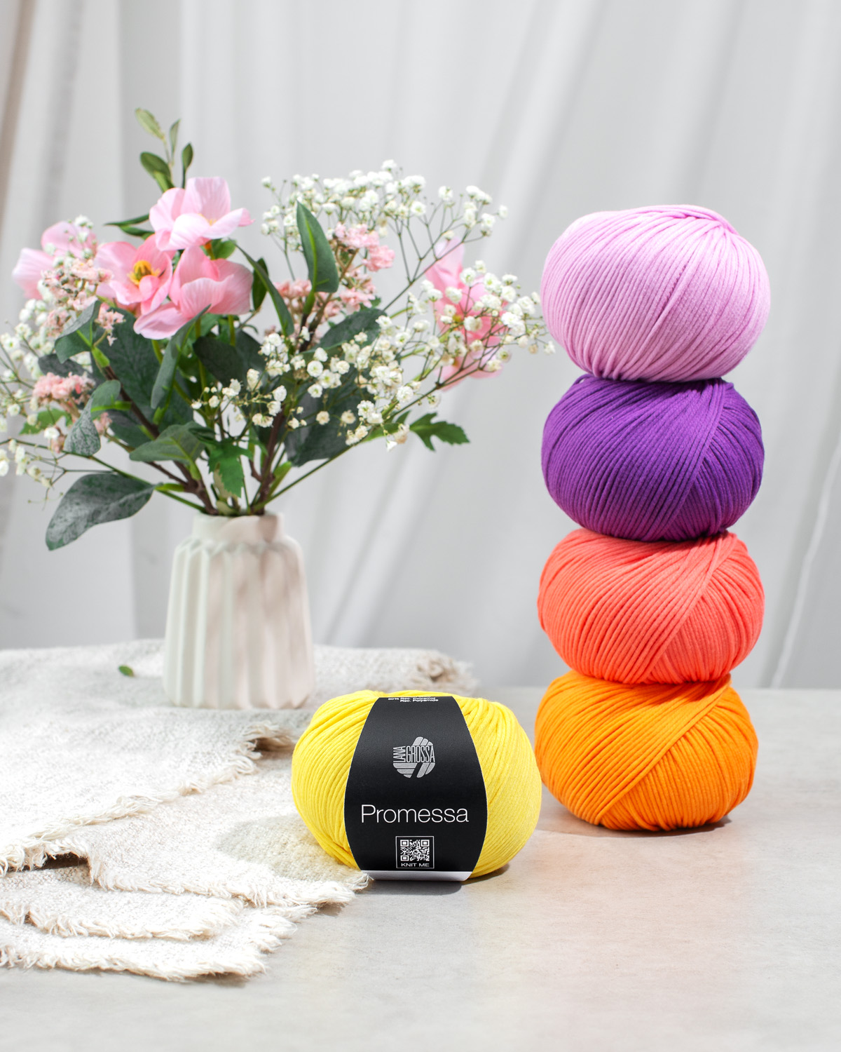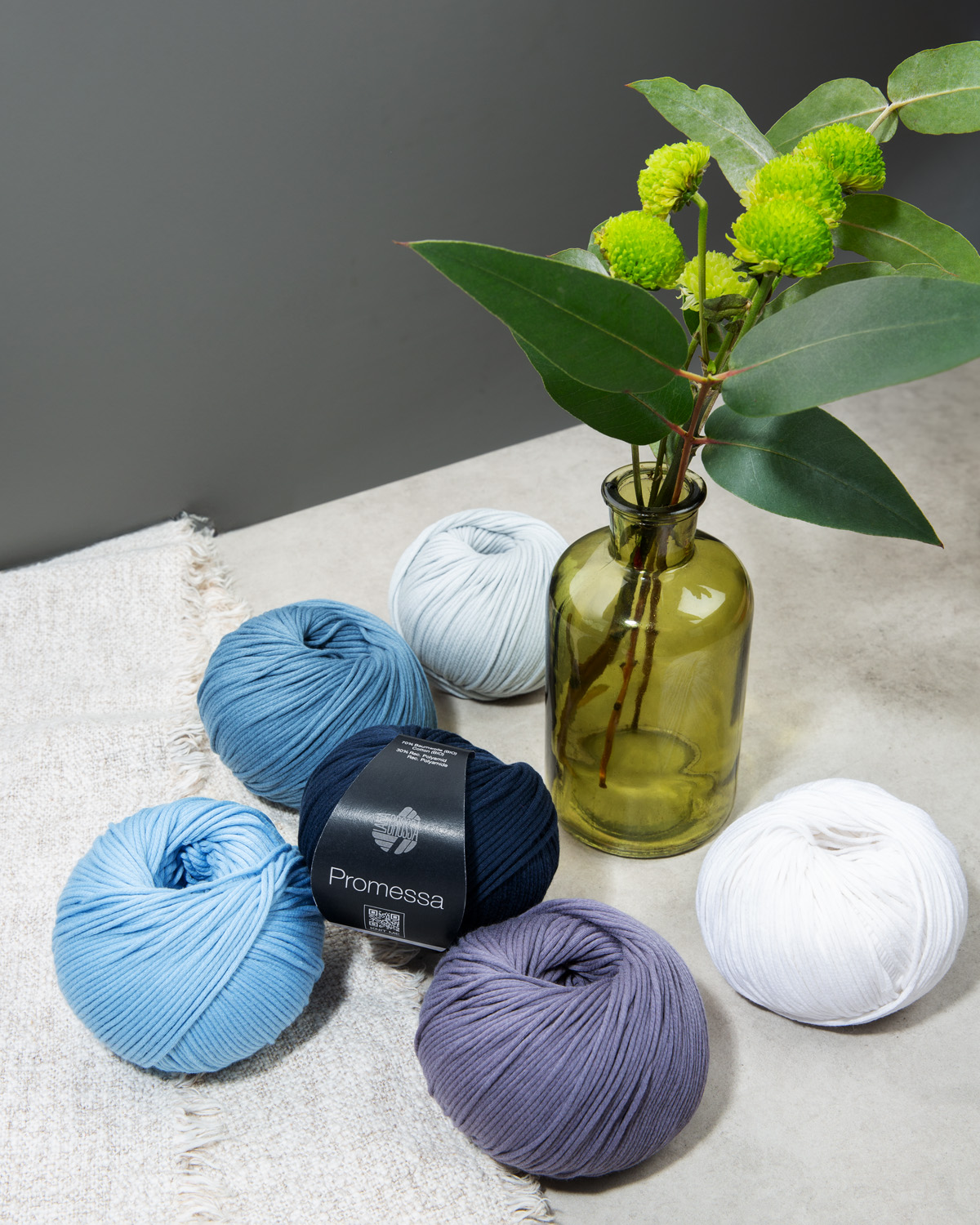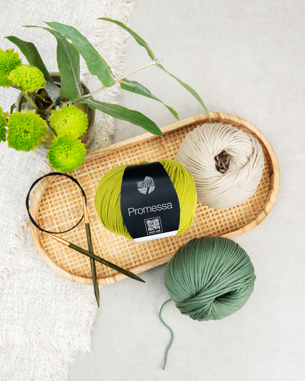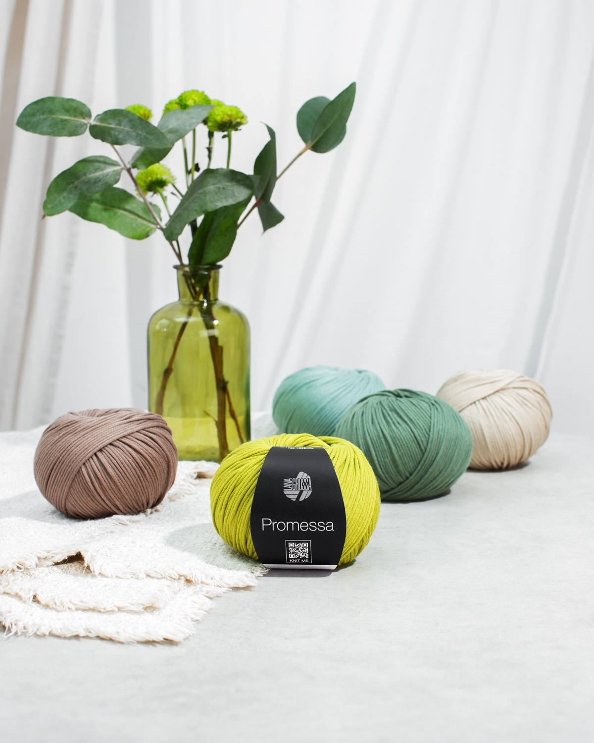 Promessa is een zacht, volumineus buisgaren met een natuurlijke uitstraling en een moderne look. De innovatieve mix van biologische katoen en gerecycled polyamide zorgt voor een aangenaam licht draaggevoel, een zachte touch en een helder stekenpatroon.