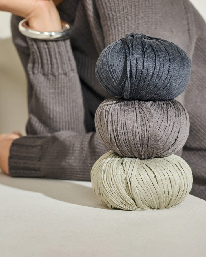 Delicate katoenvezels worden verwerkt tot een fijn lintgaren met een matte, papierachtige uitstraling, wat het een uniek, verfijnd karakter geeft.